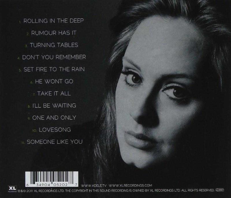 1 Rolling In The Deep 3:49 2 Rumour Has It 3:43 3 Turning Tables 4:10 4 Don't You Remember 4:03 5 Set Fire To The Rain 4:01 6 He Won't Go 4:38 7 Take It All 3:48 8 I'll Be Waiting 4:01 9 One And Only 5:48 10 Lovesong 5:16 11 Someone Like You 4:47 2011 CD AMBALAJINDADIR