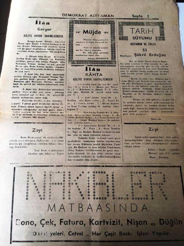 ADIYAMAN DEMOKRAT ADIYAMAN YEREL TAŞRA BASINI - -18 Mayıs 1955 YIL :2 SAYI :100-Valimiz Sayın İbrahim Tevfik Kutlar Elazığ dan Döndüler -Adıyaman Şairleri Hazırlayan : Zeki Adıyaman Şair Abdurahman Hicri Gazel - Hakikat deve Kuşu - İlan Gerger Asliye Hukuk Hakimliğinden - İlan Kahta Asliye Hukuk Hakimliğinden - Tarih Sütunu Adıyaman ve Civarı Hazırlayan : ŞÜKRÜ ERDOĞAN - Yıpranma, sararmalar, kupon kesiği ve yırtılmalar zamana bağlı olarak görülebilir.