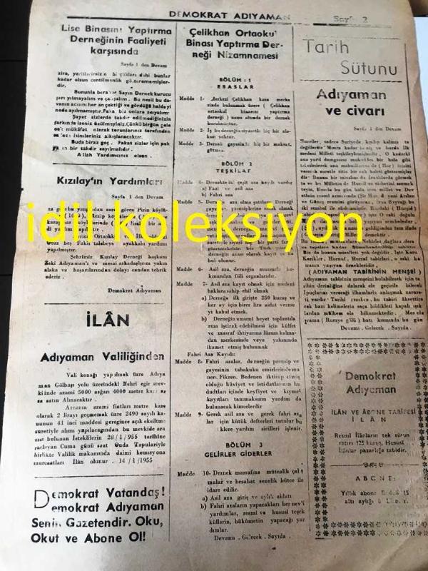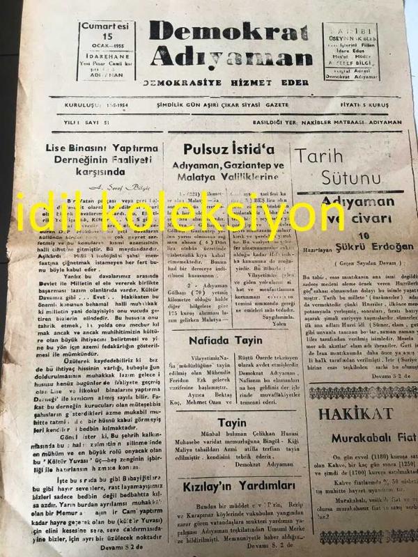 ADIYAMAN DEMOKRAT GAZETESİ YEREL TAŞRA BASINI ---15 Ocak 1955 YIL:1 Sayı :51--Lise binasının yaptırma derneğinin faaliyeti karşısında :A. Şeref Bilgiç--Pulsuz İstid'a Adıyaman ,Gaziantep ve Malatya Valiliklerine --Kızılay Yardımları --Tarih Sütunu :Adıyaman ve Civarı : Şükrü Erdoğan -İlan Adıyaman Valiliğinden -- Yıpranma, sararmalar, kupon kesiği ve yırtılmalar zamana bağlı olarak görülebilir.