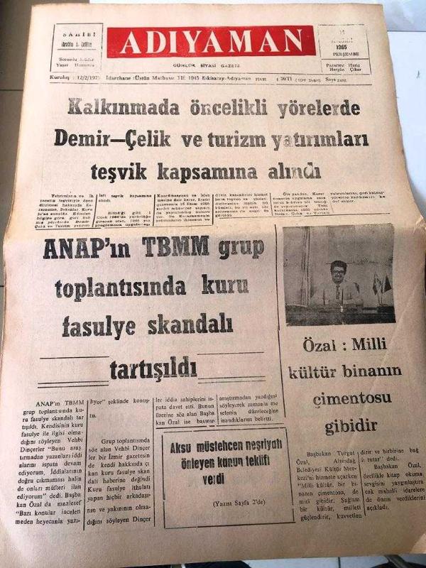 ADIYAMAN GAZETESİ YEREL TAŞRA BASINI ---14 KASIM 1985--Kalkınmada öncelikli yörelerde demir -çelik ve turizm yatırımları teşvik kapsamına alındı --ANAP 'ın TBMM grup toplantısında kuru fasulye skandalı tartışıldı --Özal :Milli kültr binanın çimentosu gibidir --Aksu müstehcen neşriyatı önleyen teklifi verdi --İthal yumurta 21 liradan satılıyor --Öykü :Irgat :Ufuk Öncü--Tekel 6 ayda 18 milyon dolarlık ihracat gerçekleşti -- Yıpranma, sararmalar, kupon kesiği ve yırtılmalar zamana bağlı olarak görülebilir.