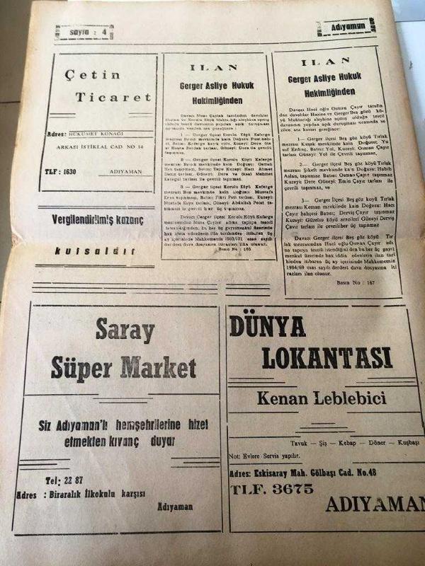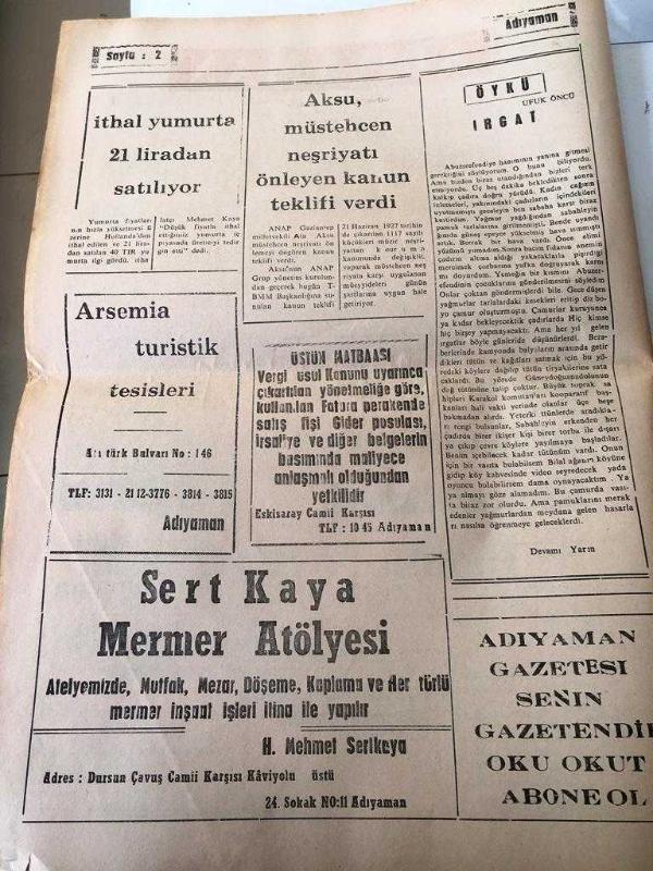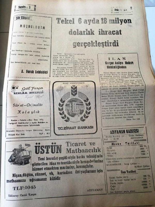 ADIYAMAN GAZETESİ YEREL TAŞRA BASINI ---14 KASIM 1985--Kalkınmada öncelikli yörelerde demir -çelik ve turizm yatırımları teşvik kapsamına alındı --ANAP 'ın TBMM grup toplantısında kuru fasulye skandalı tartışıldı --Özal :Milli kültr binanın çimentosu gibidir --Aksu müstehcen neşriyatı önleyen teklifi verdi --İthal yumurta 21 liradan satılıyor --Öykü :Irgat :Ufuk Öncü--Tekel 6 ayda 18 milyon dolarlık ihracat gerçekleşti --, İbrahim Çeliker tarafından kaleme alınmıştır. Kitap 1973 yılında [ÜSTÜN MATBAASI ] yayınlanmıştır. 4 sayfadır. ADIYAMAN GAZETESİ YEREL TAŞRA BASINI ---14 KASIM 1985--Kalkınmada öncelikli yörelerde demir -çelik ve turizm yatırımları teşvik kapsamına alındı --ANAP 'ın TBMM grup toplantısında kuru fasulye skandalı tartışıldı --Özal :Milli kültr binanın çimentosu gibidir --Aksu müstehcen neşriyatı önleyen teklifi verdi --İthal yumurta 21 liradan satılıyor --Öykü :Irgat :Ufuk Öncü--Tekel 6 ayda 18 milyon dolarlık ihracat gerçekleşti -- adlı eser Türkçe dilindedir.