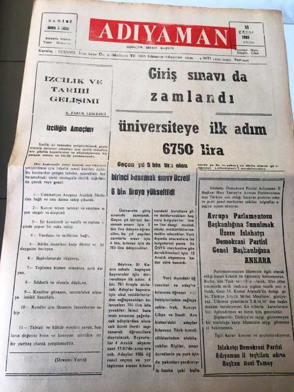 ADIYAMAN GAZETESİ YEREL TAŞRA BASINI --22 Kasım 1985 -İzcilik ve tarihi gelişimi A. Faruk Leblebici --Giriş sınavı da zamlandı üniversiteye ilk adım 6750 lira --Geçen yıl 5 bin lira olan birinci basamak sınav ücreti 6 bin liraya yükseldi --Islahatçı Demokrasi Partisi Adıyaman İl Teşkilatı Adına Başkan Hacı Tumay--İkinci köprünün inşaatı 80 milyara sigortalanacak -- Yıpranma, sararmalar, kupon kesiği ve yırtılmalar zamana bağlı olarak görülebilir.