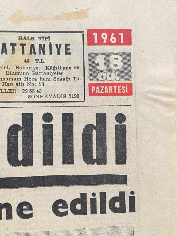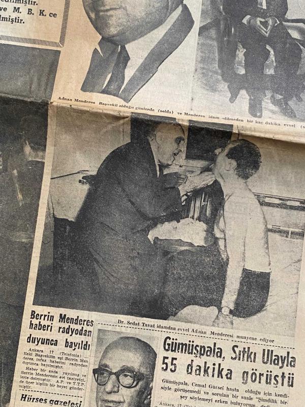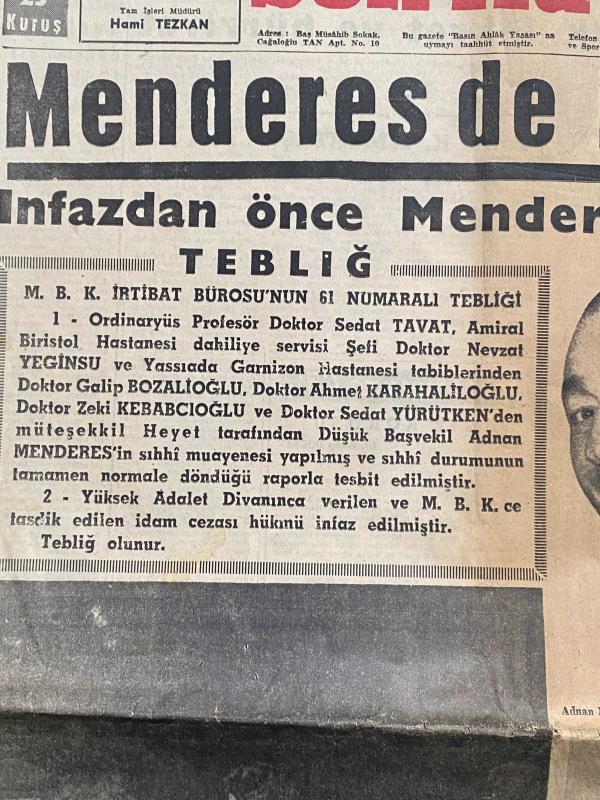 Türk siyasi tarihinin en kritik kırılma noktalarından birine tanıklık eden, 18 Eylül 1961 tarihli orijinal Son Havadis gazetesi satışta! Eski Başbakan Adnan Menderes’in idam edildiği haberini manşetten veren bu nüsha, sadece bir kağıt parçası değil; bir dönemin kapanışının ve Türkiye’nin demokrasi yolculuğundaki en hüzünlü günlerinden birinin birinci elden belgesidir. * Tarih: 18 Eylül 1961, Pazartesi. * Manşet: “Menderes de idam edildi” – İnfaz öncesi muayene detayları ve son anlara dair çarpıcı fotoğraflar. * İçerik: M.B.K. irtibat bürosunun resmi tebliği, Dr. Sedat Tavat’ın muayene anı, eşi Berrin Menderes’in haberi alış anı ve dönemin siyasi atmosferini yansıtan diğer önemli başlıklar. * Kondisyon: Yaşına göre oldukça iyi korunmuş, kat izleri dışında metinler ve fotoğraflar net okunur durumdadır. Koleksiyoncular ve tarih meraklıları için nadir bir parçadır.