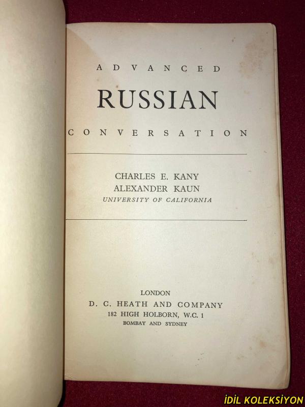 Kitap 1950 yılında D.C. HEATH AND COMPANY tarafından [LONDON] yayınlanmıştır. 126 sayfadır. ADVANCED RUSSIAN CONVERSATION / CHARLES E. KANY & ALEXANDER KAUN / D.C. HEATH AND COMPANY / İNGİLİZCE VE RUSÇA KİTAP (İLERİ RUSÇA KONUŞMA) adlı eser İngilizce dilindedir. Eserin içeriğinde Rusça dilinde bölümlere de yer verilmektedir.