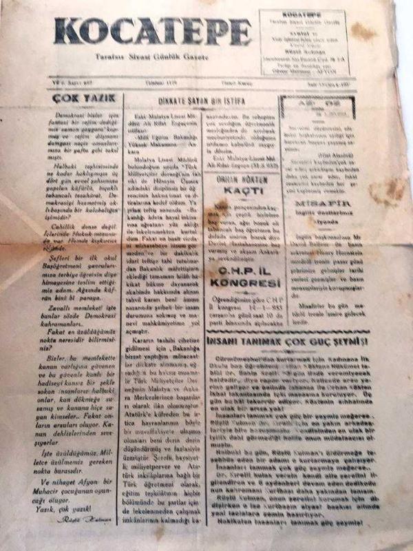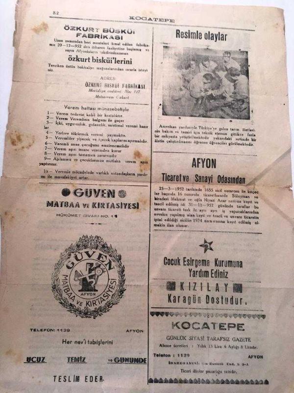 AFYON KOCATEPE GAZETESİ YEREL TAŞRA BASINI - 13 OCAK 1952 Yıl :6 Sayı :697- Çok Yazık - Dikkate Şayan Bir İstifa - Orhan Kökten Kaçtı - CHP İl Kongresi - İnsan Tanımak Çok Güç Şeymiş - Özkurt Bisküvi Fabrikası - Afyon Ticaret Odasından - Yıpranma, sararmalar, kupon kesiği ve yırtılmalar zamana bağlı olarak görülebilir.
