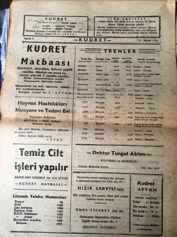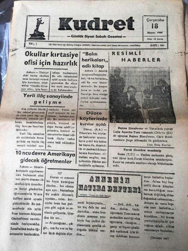 AFYON KUDRET GÜNLÜK SİYASİ GAZETESİ -YEREL TAŞRA BASINI - 18 MAYIS 1960- YIL :3 SAYI :866-Okullar kırtasiye ofisi için hazırlık- Yerli ilaç sanayinde gelişme -10 'uncu devre Amerika ya gidecek öğretmenler- "Balın Harikaları " adlı kitap -Düzce köylerinde kurslar açıldı - Resimli Haberler -Annemin Hatıra Defteri - Doktor Turgut Aktan Röntgen ve Muayene Yıpranma, sararmalar, kupon kesiği ve yırtılmalar zamana bağlı olarak görülebilir.