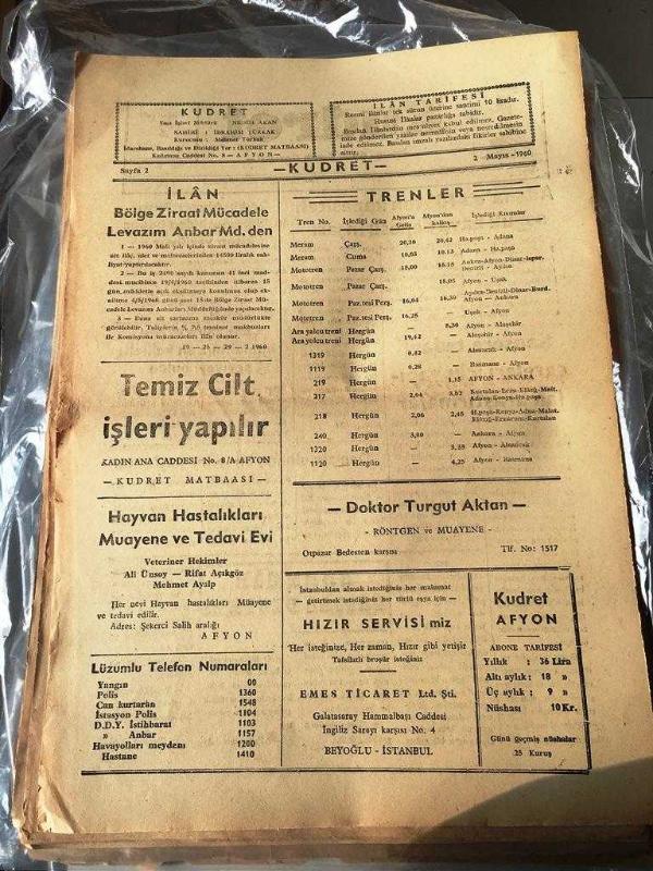 AFYON KUDRET GÜNLÜK SİYASİ GAZETESİ -YEREL TAŞRA BASINI - 2 MAYIS 1960-YIL :3 SAYI :852- Adana 'da 105 ton kapasiteli soğuk hava deposu inşası -Kansere tedavi çareleri yapılan araştırmalar -Gedik Ahmet Paşa kütüphanesinden ödünç kitap veriliyor - Çelik büro eşyası imalatımız en kaliteli seviyeyi buldu -Deniz altında bir şehir keşfedildi -Annemin hatıra defteri - İlan Bölge Ziraat Mücadele Levazım Ambar Md .den - Yıpranma, sararmalar, kupon kesiği ve yırtılmalar zamana bağlı olarak görülebilir.