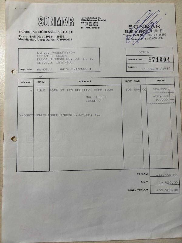 AGFA NEGATIVE FATURASI - 6 KASIM 1987 - SONMAR - TİCARET VE MÜMESSİLLİK LTD.ŞTİ. - NİŞANTAŞI, İSTANBUL - O.F.S. PRODÜKSİYON, OSMAN F. SEDEN - BEYOĞLU, İSTANBUL - ISLAK İMZALI, KAŞELİ - 21 x 29 cm EBATLI ORİJİNAL FATURA, en son 1 yıl önce güncellenmiştir.