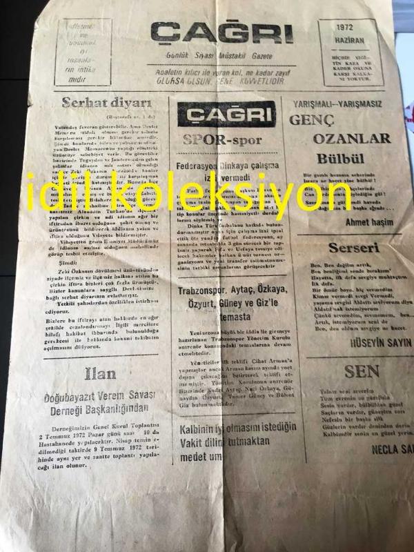 AĞRI ÇAĞRI GAZETESİ YEREL TAŞRA BASINI --27 HAZİRAN 1972 YIL :3 Sayı :682--Serhat Diyarı Şehitler Yatağı Doğu Bayazıta Leke Sürmeğe Kimsenin Hakkı Yoktur --CHP İl Kongresi Yapıldı ---Yangından Kurtarılan Araç --İzmir Verem Savaş Bölge Başkanı Şehrimize Geldi --Ege ,bu yıl 197 bin ton pamuk üretildi --Genç Ozanlar Bülbül :Ahmet Haşim --Serseri :Hüseyin Sayın--Sen :Necla Sarp --Spor :Federasyon Dinkaya Çalışma İzni Vermedi --Trabzon Spor ,Aytaç ,Özkaya , Özyurt ,Güney ve Giz 'le Temasta -- Yıpranma, sararmalar, kupon kesiği ve yırtılmalar zamana bağlı olarak görülebilir.