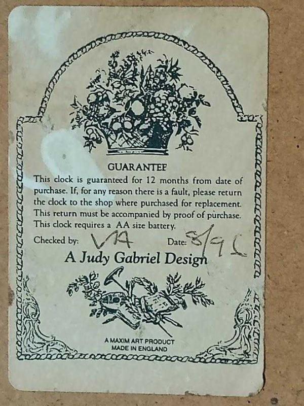AHŞAP İNGİLİZ ÜRÜNÜ DUVAR SAATİ. 1996 dan KALMA, AHŞAP İNGİLİZ ÜRÜNÜ DUVAR SAATİ. A JUDY GABRIEL DESING. KALİTELİ BASKI , MELEK TASVİRLİ. AHŞAP SAAT. DUVARA ASMALI yada MASA ÜSTÜNDEN KULLANIMA UYGUNDUR. SAAT MEKANİZMASI MALİSEF ZAMANA YENİK DÜŞMÜŞ ve YENİLENMİŞTİR. AHŞAP KISMI ORJİNAL ,ETİKETLİDİR. ÖLÇÜLERİ.. 38 x 28 cm Çekimden kaynaklı renk farkı oluşmaktadır