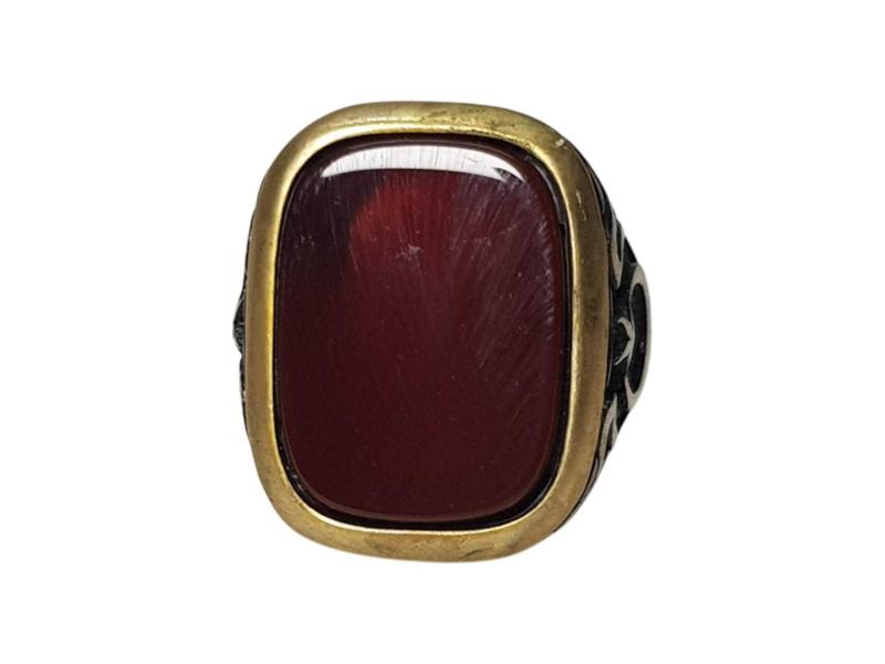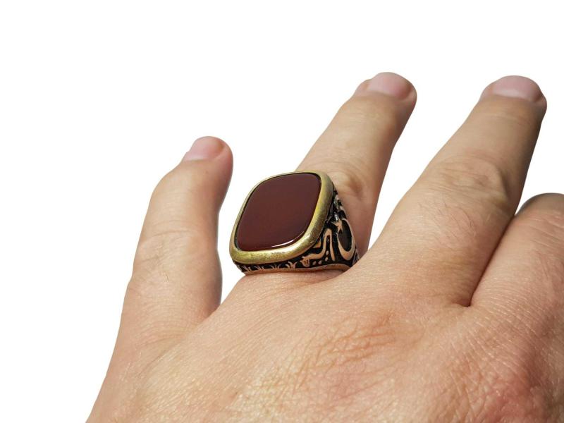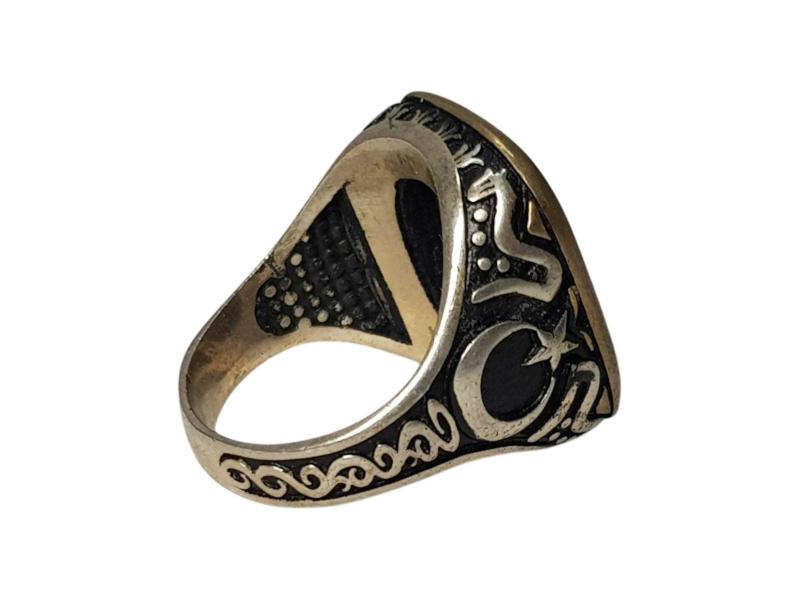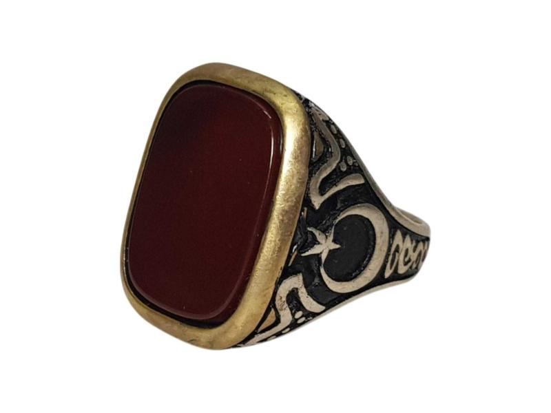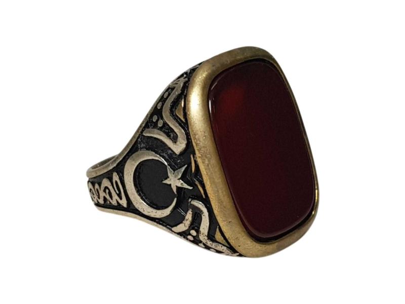 ORTASINDA BÜYÜK BİR KIRMIZI AKİK TAŞ BULUNAN, KENARLARI AY YILDIZ KABARTMA DESENLİ 925 AYAR GÜMÜŞ ERKEK YÜZÜĞÜ. İÇ ÇAP: 19,6 MM YÜZÜK NUMARASI: 22 AĞIRLIK: 15,8 GRAM