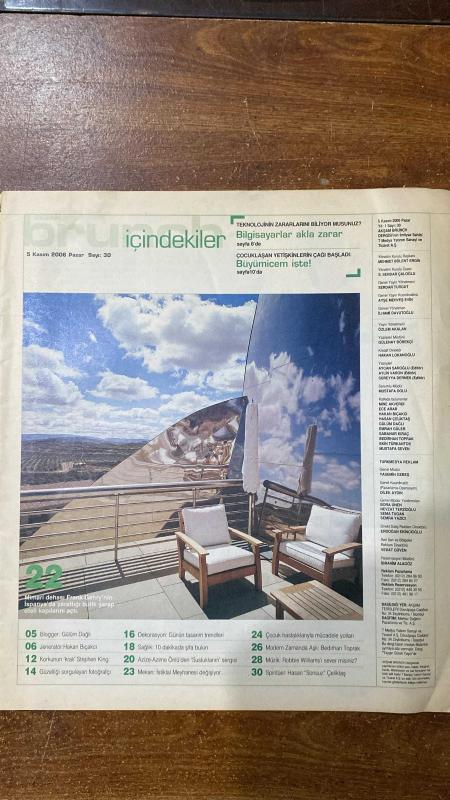AKŞAM BRUNCH DERGİSİ - SAYI : 30 - 5 KASIM 2006 - AZİZE ÖNLÜ - AZİME ÖNLÜ - FRANK GEHRY - GÜLÜM DAĞLI - HAKAN BIÇAKÇI - STEPHEN KING - HASAN ÇELİKTAŞ - BEDİRHAN TOPRAK - ROBBIE WILLIAMS - MİNE AKVERDİ - ECE ARAR - EMRAH GÜLER - SABANUR KIRAÇ - EKİN TÜRKANTOS - MUSTAFA SEVEN SUSTUKLARIM ÇADIR SERGİSİ - TEKNOLOJİNİN ZARARLARI - FRANK GEHRY BUTİK ŞARAP OTELİ - ÇOCUKLAŞAN YETİŞKİNLER ÇAĞI - STEPHEN KING DOSYASI - FOTOĞRAF VE GÜZELLİK - İSTİKLAL MEYHANESİ DEĞİŞİMİ - ÇOCUK HASTALIKLARIYLA MÜCADELE - MODERN ZAMANDA AŞK (BEDİRHAN TOPRAK) - ROBBIE WILLIAMS MÜZİK DOSYASI - SPİRİTÜEL YAZILAR (HASAN “SONSUZ” ÇELİKTAŞ) - BLOG YAZISI (BRUNCH DERGİSİ VE MOGWAI KONSERİ) - ESTORE CARDIO CRUISER SPOR ALETLERİ - SCABAL BAMBU TAKIMLARI - CARMINA CREME DE LA MOUSSE FONDÖTEN - LEFUTUR YUMURTLAYAN SAAT - KOLEKSİYON YILBAŞI AKSESUAR KAMPANYASI - GLORIA JEAN’S KIŞ KAHVELERİ - BİRAY DALKIRAN - HAKAN BIÇAKÇI - SUSAN GREENFIELD - MİNE AKVERDİ - STEPHEN KING - TABITHA KING - FRANK DARABONT - KIRK HAMME - 30 SAYFA adlı eser, Kitap > Süreli Yayınlar > Dergiler > Magazin, Moda kategorisinde İkinci El olarak satıştadır.
