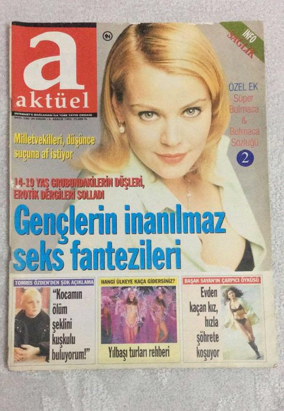 AKTÜEL HAFTALIK HABER DERGİSİ - SAYI 230 - 30 KASIM / 6 ARALIK 1995 - GENÇLERİN İNANILMAZ SEKS FANTEZİLERİ - MİLLETVEKİLLERİ DÜŞÜNCE SUÇUNA AF İSTİYOR - TOMRIS ÖZDEN: “KOCAMIN ÖLÜMÜ KUŞKULU” - BAŞAK SAYAN’IN ÇARPICI ÖYKÜSÜ - METİN KAÇAN HİDAYETE ERDİ - YILBAŞI TURLARI REHBERİ - RÜZGAR TERSİNE DÖNDÜ: DOĞU AVRUPA’DA SOL YÜKSELİYOR - BAĞIMLILARA TURBO TEDAVİ - HER ŞEYİN OKULU VAR: SAATLERİ AYARLAMA ENSTİTÜSÜ BİLE - SES DUVARINA ÇARPTILAR: BİLİMSEL SES TESTİ SONUÇLARI - FUJİ FOTOĞRAF ÖDÜLÜ AKTÜEL’E - VAJİNA MONOLOGLARI TÜRKİYE’DE - CHARLES İHANETİ HAK ETMİŞTİ: DİANA’NIN İTİRAFI - ŞEHRİN ALTI ROCK: GECE HAYATI İSTANBUL’U SARMIŞ DURUMDA - ŞARKICI EGE’NİN KORKUSU - LES FEMMES DE PARIS: ORTAKÖY’DE FRANSIZ LEZZETLERİ - DÜNYA ONLARI KONUŞACAK: CESUR POZLU 5 GÜZEL - HOP DEDİK POP: 94.8 FREKANSINDA POP YOK, PROGRAM VAR - MİGRENDEN KORKMAYIN - SU GİBİ ÖMRÜN OLSUN - KALORİSİZ LEZZET - TOMRIS ÖZDEN - BAŞAK SAYAN - METİN KAÇAN - SAYNUR KURUÇ - TANJU ÇOLAK - ARZU YANARDAĞ - BERNA ÖZTÜRK - 144 SAYFA, Ercan Arıklı tarafından kaleme alınmıştır. Eser Önay Bilgin editörlüğünde hazırlanmıştır. Kitap 1 Numara Hearst Yayıncılık tarafından yayınlanmıştır. 144 sayfadır. AKTÜEL HAFTALIK HABER DERGİSİ - SAYI 230 - 30 KASIM / 6 ARALIK 1995 - GENÇLERİN İNANILMAZ SEKS FANTEZİLERİ - MİLLETVEKİLLERİ DÜŞÜNCE SUÇUNA AF İSTİYOR - TOMRIS ÖZDEN: “KOCAMIN ÖLÜMÜ KUŞKULU” - BAŞAK SAYAN’IN ÇARPICI ÖYKÜSÜ - METİN KAÇAN HİDAYETE ERDİ - YILBAŞI TURLARI REHBERİ - RÜZGAR TERSİNE DÖNDÜ: DOĞU AVRUPA’DA SOL YÜKSELİYOR - BAĞIMLILARA TURBO TEDAVİ - HER ŞEYİN OKULU VAR: SAATLERİ AYARLAMA ENSTİTÜSÜ BİLE - SES DUVARINA ÇARPTILAR: BİLİMSEL SES TESTİ SONUÇLARI - FUJİ FOTOĞRAF ÖDÜLÜ AKTÜEL’E - VAJİNA MONOLOGLARI TÜRKİYE’DE - CHARLES İHANETİ HAK ETMİŞTİ: DİANA’NIN İTİRAFI - ŞEHRİN ALTI ROCK: GECE HAYATI İSTANBUL’U SARMIŞ DURUMDA - ŞARKICI EGE’NİN KORKUSU - LES FEMMES DE PARIS: ORTAKÖY’DE FRANSIZ LEZZETLERİ - DÜNYA ONLARI KONUŞACAK: CESUR POZLU 5 GÜZEL - HOP DEDİK POP: 94.8 FREKANSINDA POP YOK, PROGRAM VAR - MİGRENDEN KORKMAYIN - SU GİBİ ÖMRÜN OLSUN - KALORİSİZ LEZZET - TOMRIS ÖZDEN - BAŞAK SAYAN - METİN KAÇAN - SAYNUR KURUÇ - TANJU ÇOLAK - ARZU YANARDAĞ - BERNA ÖZTÜRK - 144 SAYFA adlı eser Türkçe dilindedir.