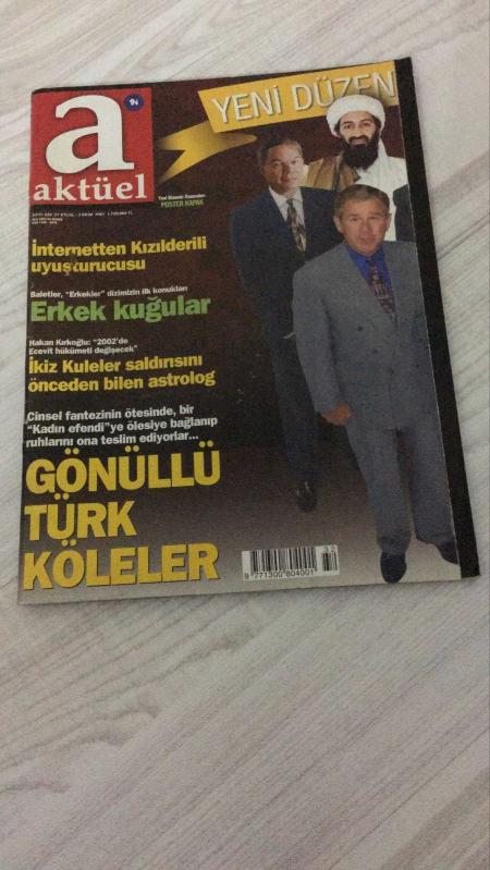 AKTÜEL HAFTALIK HABER DERGİSİ - SAYI:532 - 27 EYLÜL 3 EKİM - 2001 - ERKEK KÖLELER – SALDIRIYI BİLEN ASTROLOG: HAKAN KİRKOOĞLU – YENİ UYUŞTURUCU: SALVIA – BBG’DE MARİFETLİ YORGUNLUK – SAKİN GÜÇ: AYKUT KOCAMAN – ÇATIŞMA DEĞİL UZLAŞMA – ZÜMREYİ KARIŞTIRDI: ZONTRE – ERKEK KUĞULAR – BORSA GEYİKLERİ – MEDYANIN 11 EYLÜL KARNESİ – KIŞ ILIMLI YAPAR – BABAM YAZAMAZDI: ERTEM EĞİLMEZ – TÜRK ALMODOVAR: FERZAN ÖZPETEK – GELİBOLU’NUN ROMANI: BUKET UZUNER – MACY GRAY’İN PORTRESİ – BİR YASTIKTA THE END – JANSET: “OYUNCUYUM, VAR MI DİYECEĞİN” – KORAY’IN ALTYAZILI FİLMİ – YAŞAR’IN ATTİLA İLHAN’I – YENİ DÜZENİN OYUNCULARI: POSTER KAPAK – GÜNDE 7 KEZ ÖZÜR DİLE – KATE MOSS’UN VOGUE ÇEKİMİ - HAKAN KİRKOOĞLU – AYKUT KOCAMAN – ZONTRE – FERDİ EĞİLMEZ – ERTEM EĞİLMEZ – FERZAN ÖZPETEK – BUKET UZUNER – MACY GRAY – JANSET – KORAY CEM KİRAZ – YAŞAR – ATTİLA İLHAN – GEORGE W. BUSH – COLIN POWELL – CONDOLEEZZA RICE – USAME BİN LADİN – TONY BLAIR – PERVEZ MÜŞERREF – MUAMMER KADDAFİ – SADDAM HÜSEYİN – 98 SAYFA, Ercan Arıklı tarafından kaleme alınmıştır. Eser Önay Bilgin editörlüğünde hazırlanmıştır. Kitap 1 Numara Hearst Yayıncılık tarafından yayınlanmıştır. 98 sayfadır. AKTÜEL HAFTALIK HABER DERGİSİ - SAYI:532 - 27 EYLÜL 3 EKİM - 2001 - ERKEK KÖLELER – SALDIRIYI BİLEN ASTROLOG: HAKAN KİRKOOĞLU – YENİ UYUŞTURUCU: SALVIA – BBG’DE MARİFETLİ YORGUNLUK – SAKİN GÜÇ: AYKUT KOCAMAN – ÇATIŞMA DEĞİL UZLAŞMA – ZÜMREYİ KARIŞTIRDI: ZONTRE – ERKEK KUĞULAR – BORSA GEYİKLERİ – MEDYANIN 11 EYLÜL KARNESİ – KIŞ ILIMLI YAPAR – BABAM YAZAMAZDI: ERTEM EĞİLMEZ – TÜRK ALMODOVAR: FERZAN ÖZPETEK – GELİBOLU’NUN ROMANI: BUKET UZUNER – MACY GRAY’İN PORTRESİ – BİR YASTIKTA THE END – JANSET: “OYUNCUYUM, VAR MI DİYECEĞİN” – KORAY’IN ALTYAZILI FİLMİ – YAŞAR’IN ATTİLA İLHAN’I – YENİ DÜZENİN OYUNCULARI: POSTER KAPAK – GÜNDE 7 KEZ ÖZÜR DİLE – KATE MOSS’UN VOGUE ÇEKİMİ - HAKAN KİRKOOĞLU – AYKUT KOCAMAN – ZONTRE – FERDİ EĞİLMEZ – ERTEM EĞİLMEZ – FERZAN ÖZPETEK – BUKET UZUNER – MACY GRAY – JANSET – KORAY CEM KİRAZ – YAŞAR – ATTİLA İLHAN – GEORGE W. BUSH – COLIN POWELL – CONDOLEEZZA RICE – USAME BİN LADİN – TONY BLAIR – PERVEZ MÜŞERREF – MUAMMER KADDAFİ – SADDAM HÜSEYİN – 98 SAYFA adlı eser Türkçe dilindedir.