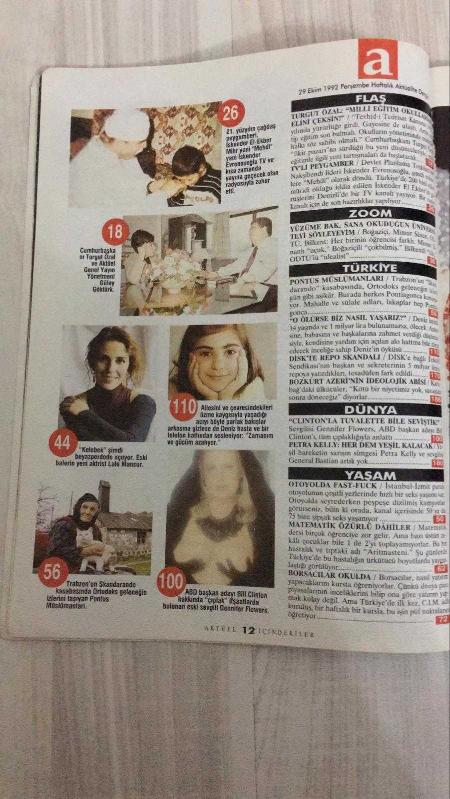 AKTÜEL HAFTALIK HABER DERGİSİ - SAYI: 69 - 29 EKİM 4 KASIM 1992 - TURGUT ÖZAL: MİLLİ EĞİTİM OKULLARDAN ELİNİ ÇEKSİN – TV’Lİ PEYGAMBER: İSKENDER EVRENOSOĞLU – CLINTON’LA TUVALETTE BİLE SEVİŞTİK – KELEBEK BEYAZPERDEDE UÇUYOR – PONTUS MÜSLÜMANLARI – DENİZ: ZAMANIM VE GÜCÜM AZALIYOR – DİSK’TE REPO SKANDALI – BOZKURT AZERİ’NİN İDEOLOJİK ABİSİ – PETRA KELLY: HER DEM YEŞİL KALACAK – OTOYOLDA FAST-FUCK – MATEMATİK ÖZÜRLÜ DAHİLER – BORSACILAR OKULDA – NOBEL BARIŞ ÖDÜLÜ: MENCHU’YA BASKI – DÜNYA DOKUZ DOĞURUYOR – WHITNEY HOUSTON TÜRKİYE KONSERİ İPTAL – SEBNEM DÖNMEZ İŞSİZ KALDI - TURGUT ÖZAL – GÜLAY GÖKTÜRK – İSKENDER EVRENOSOĞLU – LALE MANSUR – GENNIFER FLOWERS – BILL CLINTON – DENİZ – FİKRİ SAĞLAR – MAHİR KAYNAK – RIGOBERTA MENCHU – PETRA KELLY – GENERAL BASTIAN – WHITNEY HOUSTON – SEBNEM DÖNMEZ – JAMIE LEE CURTIS – JANET LEIGH – TONY CURTIS – UFUK GÜLDEMİR – VICENTE MENCHU - 196 SAYFA, Ercan Arıklı tarafından kaleme alınmıştır. Eser Önay Bilgin editörlüğünde hazırlanmıştır. Kitap 1 Numara Hearst Yayıncılık tarafından yayınlanmıştır. 196 sayfadır. AKTÜEL HAFTALIK HABER DERGİSİ - SAYI: 69 - 29 EKİM 4 KASIM 1992 - TURGUT ÖZAL: MİLLİ EĞİTİM OKULLARDAN ELİNİ ÇEKSİN – TV’Lİ PEYGAMBER: İSKENDER EVRENOSOĞLU – CLINTON’LA TUVALETTE BİLE SEVİŞTİK – KELEBEK BEYAZPERDEDE UÇUYOR – PONTUS MÜSLÜMANLARI – DENİZ: ZAMANIM VE GÜCÜM AZALIYOR – DİSK’TE REPO SKANDALI – BOZKURT AZERİ’NİN İDEOLOJİK ABİSİ – PETRA KELLY: HER DEM YEŞİL KALACAK – OTOYOLDA FAST-FUCK – MATEMATİK ÖZÜRLÜ DAHİLER – BORSACILAR OKULDA – NOBEL BARIŞ ÖDÜLÜ: MENCHU’YA BASKI – DÜNYA DOKUZ DOĞURUYOR – WHITNEY HOUSTON TÜRKİYE KONSERİ İPTAL – SEBNEM DÖNMEZ İŞSİZ KALDI - TURGUT ÖZAL – GÜLAY GÖKTÜRK – İSKENDER EVRENOSOĞLU – LALE MANSUR – GENNIFER FLOWERS – BILL CLINTON – DENİZ – FİKRİ SAĞLAR – MAHİR KAYNAK – RIGOBERTA MENCHU – PETRA KELLY – GENERAL BASTIAN – WHITNEY HOUSTON – SEBNEM DÖNMEZ – JAMIE LEE CURTIS – JANET LEIGH – TONY CURTIS – UFUK GÜLDEMİR – VICENTE MENCHU - 196 SAYFA adlı eser Türkçe dilindedir.
