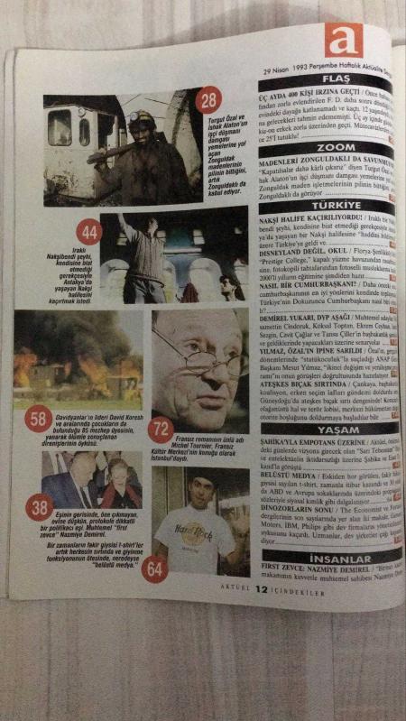 AKTÜEL – SAYI 95 – 29 NİSAN–5 MAYIS 1993 – 130 SAYFA – ÜÇ AYDA 400 KİŞİ TARAFINDAN İSTİSMARA UĞRAYAN 12 YAŞINDAKİ F.’NİN DEHŞET ÖYKÜSÜ – ZONGULDAK MADENLERİ KAPATILSIN MI? ÖZAL VE ALATON’A “İŞÇİ DÜŞMANI” TEPKİSİ – IRAKLI NAKŞİBENDİ ŞEYHİNDEN TÜRKİYE’DE HALİFE KAÇIRMA GİRİŞİMİ – DAVİDYANLAR’IN LİDERİ DAVID KORESH VE 85 KİŞİNİN YANARAK ÖLÜMÜ – NAZMİYE DEMİREL: MUHTEMEL “FIRST ZEVCE” – T-SHIRT’LER ARTIK “BELÜSTÜ MEDYA” – ŞAHİKA VE ESAT TEKAND’LA “ENTELLEKTÜEL İKTİDARSIZLIK” ÜZERİNE – MICHEL TOURNIER İSTANBUL’DA – “PRESTIGE COLLEGE”: OKUL MU, DISNEYLAND MI? – CUMHURBAŞKANLIĞI İÇİN PORTRE ARAYIŞI – DEMİREL YUKARI, DYP AŞAĞI: CİNDORUK, TOPTAN, CEYHUN, SEZGİN, ÇAĞLAR, ÇİLLER – MESUT YILMAZ, ÖZAL’IN “İKİNCİ DEĞİŞİM” PROGRAMINA SARILDI – GÜNEYDOĞU’DA ATEŞKES BIÇAK SIRTINDA – DİNOZORLARIN SONU: DEV ŞİRKETLER ÇAĞI KAPANIYOR – CEM ÖZER’DEN “PRENSESİM ESİN” – HARD ROCK NEW YORK – HER HAFTA: MAHIR KAYNAK, MEHMET YALOM, AHMET TAN, VIVET KANETTİ, NİGİN CERRAHOĞLU – SİYASET, TOPLUM, YAŞAM, DÜNYA, KÜLT, Ercan Arıklı tarafından kaleme alınmıştır. Eser Önay Bilgin editörlüğünde hazırlanmıştır. Kitap 1 Numara Hearst Yayıncılık tarafından yayınlanmıştır. 122 sayfadır. AKTÜEL – SAYI 95 – 29 NİSAN–5 MAYIS 1993 – 130 SAYFA – ÜÇ AYDA 400 KİŞİ TARAFINDAN İSTİSMARA UĞRAYAN 12 YAŞINDAKİ F.’NİN DEHŞET ÖYKÜSÜ – ZONGULDAK MADENLERİ KAPATILSIN MI? ÖZAL VE ALATON’A “İŞÇİ DÜŞMANI” TEPKİSİ – IRAKLI NAKŞİBENDİ ŞEYHİNDEN TÜRKİYE’DE HALİFE KAÇIRMA GİRİŞİMİ – DAVİDYANLAR’IN LİDERİ DAVID KORESH VE 85 KİŞİNİN YANARAK ÖLÜMÜ – NAZMİYE DEMİREL: MUHTEMEL “FIRST ZEVCE” – T-SHIRT’LER ARTIK “BELÜSTÜ MEDYA” – ŞAHİKA VE ESAT TEKAND’LA “ENTELLEKTÜEL İKTİDARSIZLIK” ÜZERİNE – MICHEL TOURNIER İSTANBUL’DA – “PRESTIGE COLLEGE”: OKUL MU, DISNEYLAND MI? – CUMHURBAŞKANLIĞI İÇİN PORTRE ARAYIŞI – DEMİREL YUKARI, DYP AŞAĞI: CİNDORUK, TOPTAN, CEYHUN, SEZGİN, ÇAĞLAR, ÇİLLER – MESUT YILMAZ, ÖZAL’IN “İKİNCİ DEĞİŞİM” PROGRAMINA SARILDI – GÜNEYDOĞU’DA ATEŞKES BIÇAK SIRTINDA – DİNOZORLARIN SONU: DEV ŞİRKETLER ÇAĞI KAPANIYOR – CEM ÖZER’DEN “PRENSESİM ESİN” – HARD ROCK NEW YORK – HER HAFTA: MAHIR KAYNAK, MEHMET YALOM, AHMET TAN, VIVET KANETTİ, NİGİN CERRAHOĞLU – SİYASET, TOPLUM, YAŞAM, DÜNYA, KÜLT adlı eser Türkçe dilindedir.