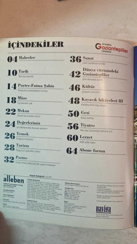 ALLEBEN İSTANBUL GAZİANTEPLİLER DERNEĞİ'NİN SÜRELİ YAYIN ORGANI DERGİSİ - EYLÜL 2014 — SAYI: 38 TAHİR TEKİN ÖZTAN - OYA ÖZTAN PEKER - DERYA TÜBA NOYAN - FATMA ŞAHİN - AHMET KAFADAR - BÜLENT KARADAĞ - HÜSEYİN KANATLI - BURHAN ATİK - BELGİN ATEŞ - OLCAY BİLGİLİ - NURİ BİLGE - HACI ÇAPAR - OYA ARSLANOĞLU ÇETİNKAYA - ASLIHAN ÇETİN - TÜRKAN UĞUR DAI - NURİ DEVELİ - CEVAT CURALP - FÜSUN DOĞANVİLMAZ - ERHAN ECE - SENA BETÜL KARADAĞ - ENVER OSMAN GAZİ - YAŞAR KUŞATA - SERMET SÖYLEMEZ - HASAN TANYOL GAZİANTEP’TEN İSTANBUL’A UZANAN KÜLTÜR IRMAĞI - FATMA ŞAHİN PORTRESİ - AHMET KAFADAR’IN BAŞARI HİKAYESİ - BÜYÜLÜ GAZİANTEP BAKLAVASININ SIRLARI - MEDUSA CAM ESERLER MÜZESİ - TAHMİS KAHVESİ’NE ZİYARET - GAZİANTEP’İN CAN DAMARI KASTELLER - TATLI BİR SERİNLİK - AMACIMIZ MEMLEKETE HİZMET - EŞİ BENZERİ OLMAYAN MÜZE - ZEYTİN BU HANDAN ALINIR - İYİ BAKLAVA BEŞ DUYUYA SESLENİR - CAM SANATININ İZİNDE - ŞİRE DÜNYAYA AÇILDI - ÇARŞININ ZİNCİRLİSİ - KAYACIK HİKÂYELERİ III - KAFAMA - TAM TAKIM EKSİKSİZ 66 SAYFA, ALİ UÇAR tarafından kaleme alınmıştır. Eser TURGAY HANEDAN editörlüğünde hazırlanmıştır. Kitap . tarafından yayınlanmıştır. 66 sayfadır. ALLEBEN İSTANBUL GAZİANTEPLİLER DERNEĞİ'NİN SÜRELİ YAYIN ORGANI DERGİSİ - EYLÜL 2014 — SAYI: 38 TAHİR TEKİN ÖZTAN - OYA ÖZTAN PEKER - DERYA TÜBA NOYAN - FATMA ŞAHİN - AHMET KAFADAR - BÜLENT KARADAĞ - HÜSEYİN KANATLI - BURHAN ATİK - BELGİN ATEŞ - OLCAY BİLGİLİ - NURİ BİLGE - HACI ÇAPAR - OYA ARSLANOĞLU ÇETİNKAYA - ASLIHAN ÇETİN - TÜRKAN UĞUR DAI - NURİ DEVELİ - CEVAT CURALP - FÜSUN DOĞANVİLMAZ - ERHAN ECE - SENA BETÜL KARADAĞ - ENVER OSMAN GAZİ - YAŞAR KUŞATA - SERMET SÖYLEMEZ - HASAN TANYOL GAZİANTEP’TEN İSTANBUL’A UZANAN KÜLTÜR IRMAĞI - FATMA ŞAHİN PORTRESİ - AHMET KAFADAR’IN BAŞARI HİKAYESİ - BÜYÜLÜ GAZİANTEP BAKLAVASININ SIRLARI - MEDUSA CAM ESERLER MÜZESİ - TAHMİS KAHVESİ’NE ZİYARET - GAZİANTEP’İN CAN DAMARI KASTELLER - TATLI BİR SERİNLİK - AMACIMIZ MEMLEKETE HİZMET - EŞİ BENZERİ OLMAYAN MÜZE - ZEYTİN BU HANDAN ALINIR - İYİ BAKLAVA BEŞ DUYUYA SESLENİR - CAM SANATININ İZİNDE - ŞİRE DÜNYAYA AÇILDI - ÇARŞININ ZİNCİRLİSİ - KAYACIK HİKÂYELERİ III - KAFAMA - TAM TAKIM EKSİKSİZ 66 SAYFA adlı eser Türkçe dilindedir.