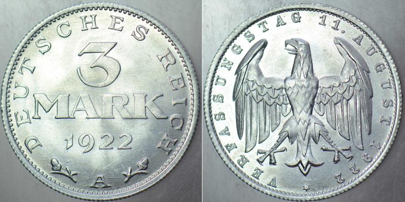 ALMANYA 3 MARK 1922 A. SİRKÜLASYON HATIRA - WEİMAR ANAYASASININ 3. YILI ANISINA. ALÜMİNYUM 28 mm. ÇİL., 20 gün önce satışa sunulmuştur.