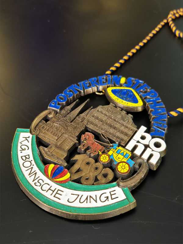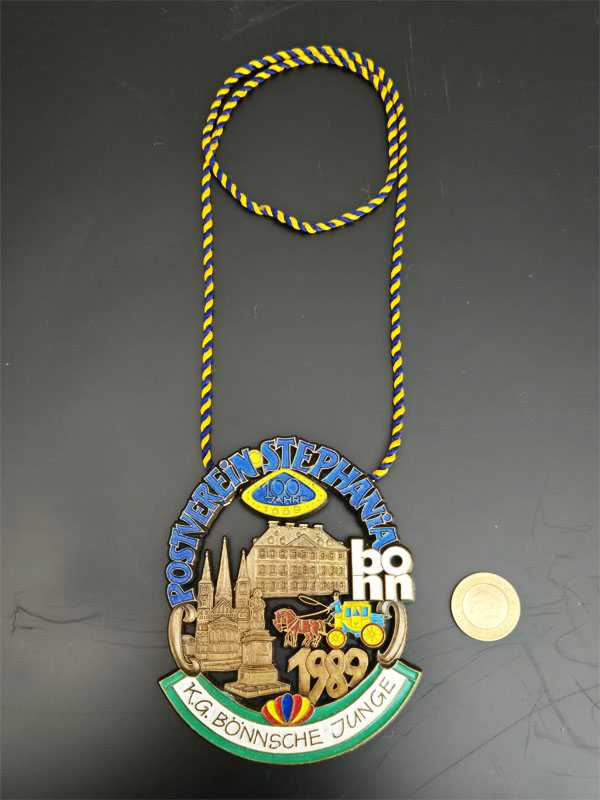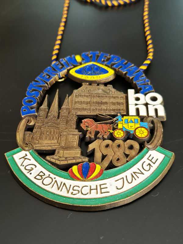 Almanya'da düzenlenen geleneksel karnaval şenlikleri için üretilmiş tematik bir madalyadır. İlgili Kulüp: Bonn şehrindeki "Postverein Stephania" ve "K.G. Bönnsche Junge" organizasyonlarına aittir. Tarih: Madalyanın üzerinde 1989 yılı vurgulanmıştır. Tasarım: Bonn şehrinin simgelerini (Bonn Minster kilisesi gibi) ve bir karnaval arabasını içermektedir. Kullanım: Karnaval mevsiminde giyilen kostümleri tamamlayan dekoratif bir aksesuardır.