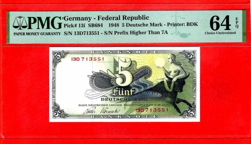 ALMANYA GERMANY 5 Deutsche Mark 1948 p13i UNC PMG 64 EPQ (TK11 986) ÇİL, 4 ay önce satışa sunulmuştur.