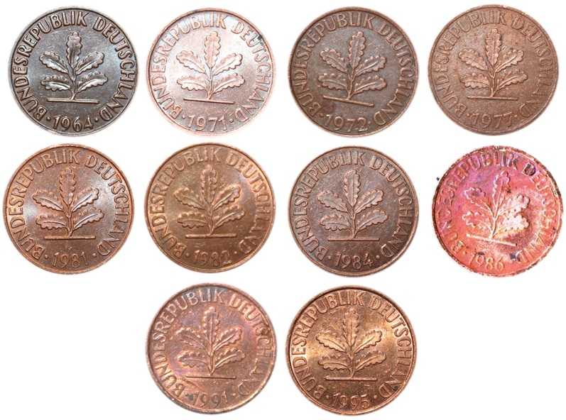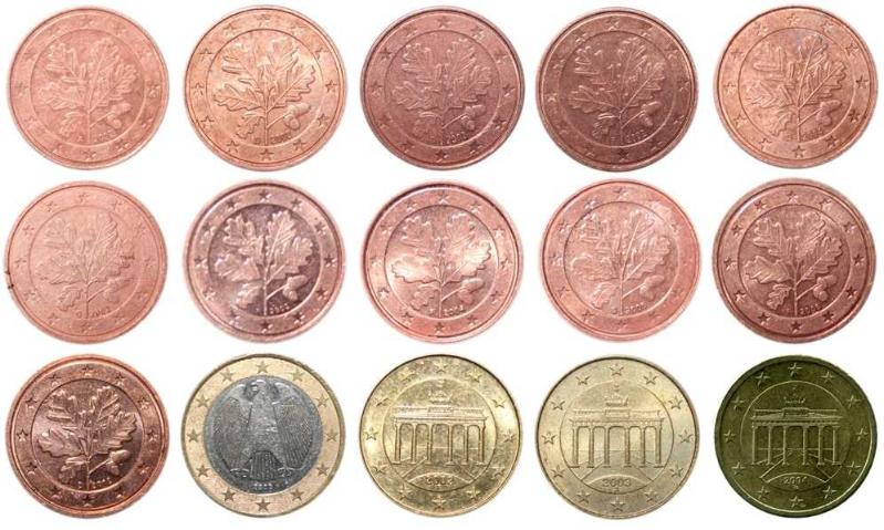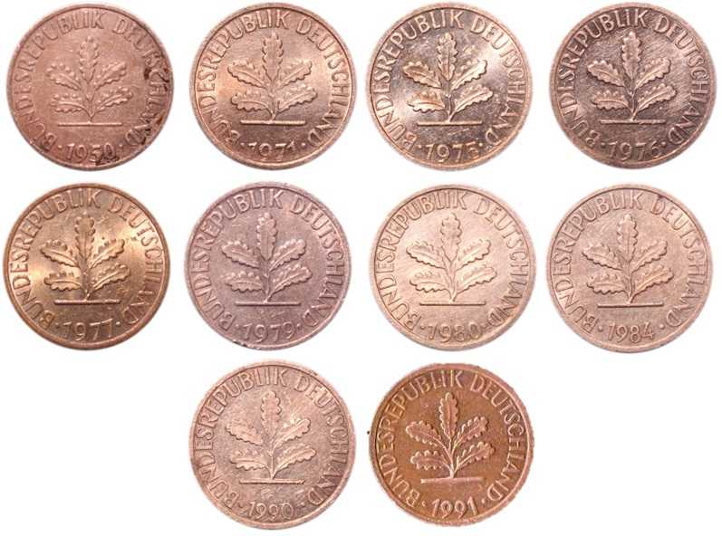 1 PFENNING ( 10 ADET ) 1950-1971-1975-1976-1977-1979-1980-1984-1990-1991 2 PFENNING ( 10 ADET ) 1964-1971-1972-1977-1981-1982-1984-1986-1991-1995 5 PFENNING ( 2 ADET ) 1970-1981 10 PFENNING ( 2 ADET ) 1950-1981 50 PFENNING ( 1 ADET ) 1949 50 CENT ( 1 ADET ) 2004G 10 CENT ( 2 ADET ) 2002F-2003A 5 CENT ( 5 ADET ) 2002A-2002D-2002F-2002G-2004D 2 CENT ( 3 ADET ) 2002G-2008F-2012D 1 CENT ( 3 CENT ) 2002F-2004F-2005G 1 EURO ( 1 ADET ) 2002