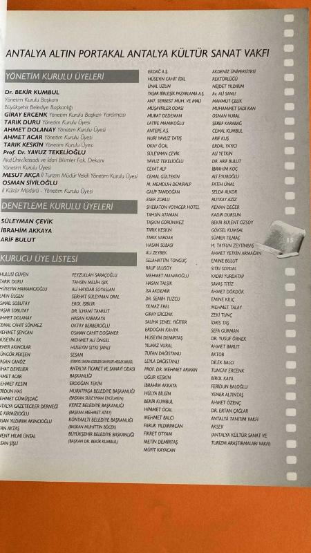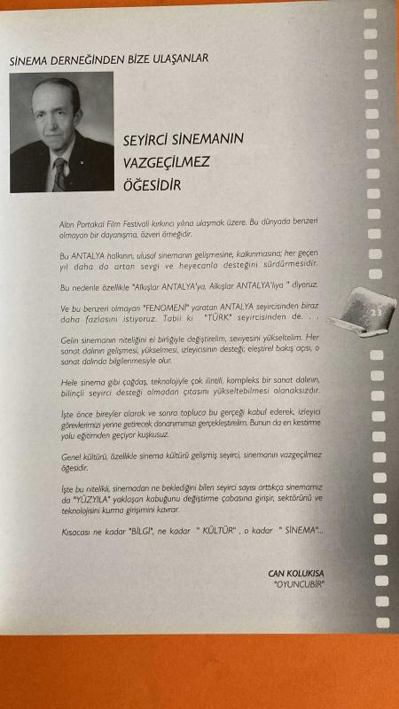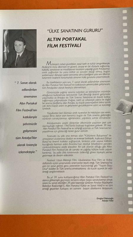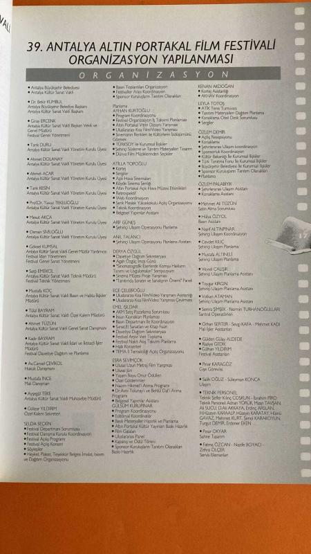 ALTIN PORTAKAL DERGİSİ - 1 -5 EKİM 2002 – ANTALYA FİLM FESTİVALİ, T.C. KÜLTÜR BAKANLIĞI, ANTALYA BELEDİYESİ – AVNİ TOLUNAY – ÜMİT UTKU – HALİT REFİĞ – METİN ERKSAN – A. YILMAZ – MEMDUH ÜN – E. GÖREÇ – ERTEM GÖREÇ – MURAT KÖSEOĞLU – NEVZAT PESEN – TURGUT DEMİRAĞ – TANJU GÜRSU – METİN DİNLER – ERDOĞAN TOKATLI – FEVZİ TUNA – AYLA ALGAN – BEKLAN ALGAN – İZZET GÜNAY – SELMA GÜNERİ – SADIK SENDİL – YILMAZ GÜNEY – BELGİN DORUK – ERTEM EĞİLMEZ – HAYATİ HAMZAOĞLU – MÜNİR ÖZKUL – LÂLE BELKIS – HÜLYA KOÇYİĞİT – ZAFER KARAKAŞ – MUAZZEZ ARÇAY – NÜZHET ERMAN – ZEYNEP AKSU – FATMA KARANFİL – ENGİN ÇAĞLAR – GURBET KUŞLARI – ACI HAYAT – YARIN BİZİMDİR – AĞAÇLAR AYAKTA ÖLÜR – KIZGIN DELİKANLI – KEŞANLI ALİ – ERKEK ALİ – İSTANBUL’UN KIZLARI – DUVARLARIN ÖTESİ – AŞK VE KİN – AHTAPOTUN KOLLARI – KARANLIKTA UYANANLAR – SEVMEK ZAMANI – BİN YILLIK YOL – BÜYÜK ÖÇ – BİR ÇİRKİN ADAM – KINALI YAPINCAK – KALBİMİN EFENDİSİ – YUVANIN BEKÇİLERİ – RÜYA GİBİYDİ – ALTIN PORTAKAL FİLM FESTİVALİ TARİ - 58 SAYFA adlı eser Türkçe dilindedir.