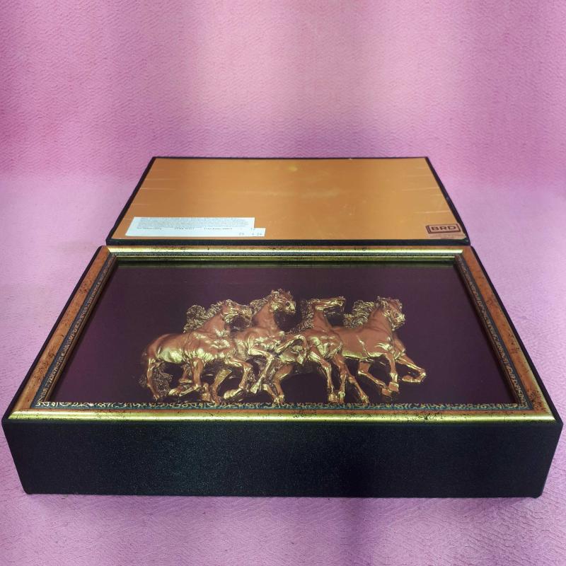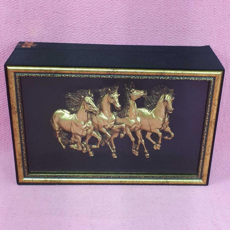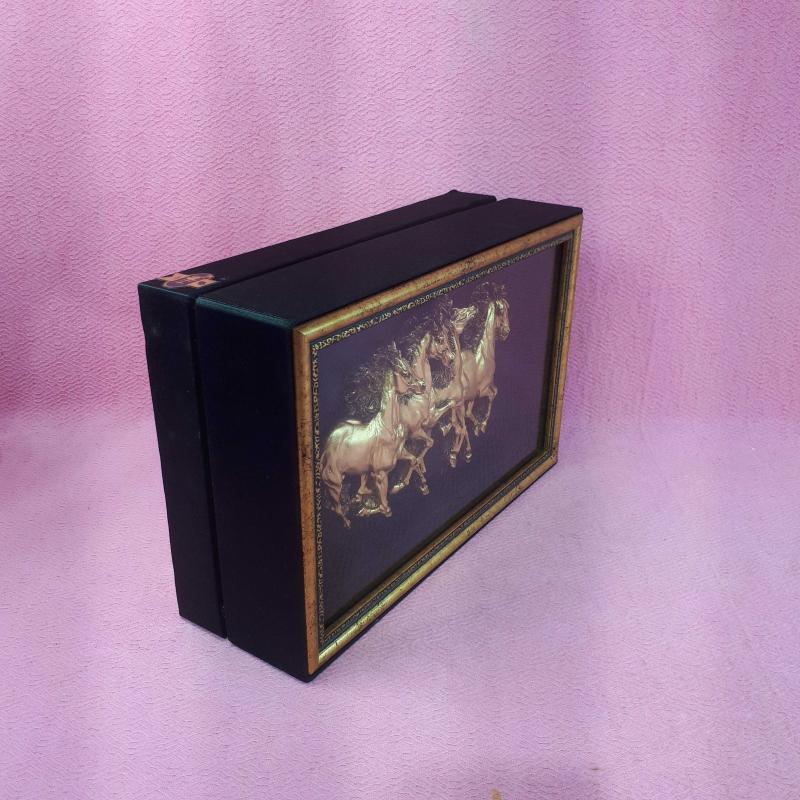 20 x 10 x 30 cm . SİYAH RENKLİ BEZ KAPLAMA , KUTUNUN , KAPAĞIN İÇ KISIMLARI VE TABANI ALTIN YALDIZ MUKAVVA , 3D GÖRSELLİ YILKI ATLARININ MONTE EDİLDİĞI KAPAK ALTIN YALDIZ ÇERÇEVELİ VE CAMLI . KUSURSUZ .