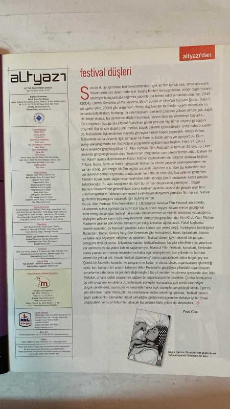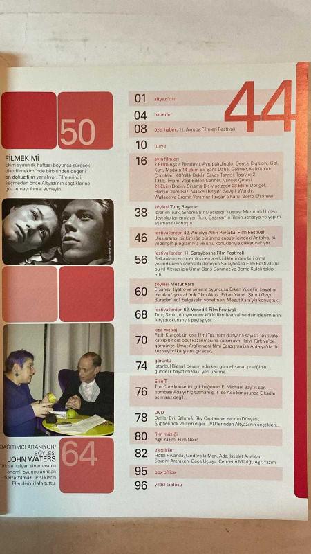 ALTYAZI AYLIK SİNEMA DERGİSİ - EKİM 2005 SAYI: 44 MEMDUH ÜN - TUNÇ BAŞARAN - SERRA YILMAZ - JOHN WATERS - RADU MIHAILEANU - İBRAHİM TÜRK - UMUT BARİŞ DÖNMEZ - BERNA KULELİ - MESUT KARA - ERKAN YÜCEL - TUNÇ ŞAHİN - FATİH KIZILGÖK - UMUT ARAL - ÖZGE SAMANCI - NADİR ÖPERLİ - ÖVGÜ GÖKÇE - EGE EDENER - NICK PARK FESTİVAL DÜŞLERİ - ALTIN PORTAKAL - FİLMEKİMİ - VENEDİK FİLM FESTİVALİ - SARAYBOSNA FİLM FESTİVALİ - WALLACE VE GROMIT YARAMAZ TAVŞAN’A KARŞI - SİNEMA BİR MUCİZEDİR - GECE NÖBETİ - BİR ŞANS DAHA - KALKÜTA’NIN ÇOCUKLARI - HOTEL RWANDA - CINDERELLA MAN - ADA - İSKELET ANAHTAR - SEVGİYİ ARARKEN - GECE UÇUŞU - CENNETİN MÜZİĞİ - AŞK YAZIM - AŞKLA RANDEVU - AVRUPALI JİGOLO - BİR ŞANS DAHA - GELİNLER - 40 YILLIK BEKÂR - SAVAŞ TANRISI - TAŞIYICI 2 - VAAT EDİLEN CENNET - VAHŞET ÇETESİ - DOOM - DÖNGEL - HERBIE TAM GAZ - MASKELİ BEŞLER - SEVGİLİ WENDY - ZORRO EFSANESİ - DELİLER EVİ - SALOMÉ - SKY CAPTAIN VE YARININ DÜNYASI - ŞÜPHELİ YOK - AŞK YAZIM FİLM NOIR - - TAM TAKIM EKSİKSİZ 96 SAYFA, YAMAÇ OKUR tarafından kaleme alınmıştır. Eser FIRAT YÜCEL editörlüğünde hazırlanmıştır. Kitap [ŞAN OFSET MATBAA] yayınlanmıştır. 96 sayfadır. ALTYAZI AYLIK SİNEMA DERGİSİ - EKİM 2005 SAYI: 44 MEMDUH ÜN - TUNÇ BAŞARAN - SERRA YILMAZ - JOHN WATERS - RADU MIHAILEANU - İBRAHİM TÜRK - UMUT BARİŞ DÖNMEZ - BERNA KULELİ - MESUT KARA - ERKAN YÜCEL - TUNÇ ŞAHİN - FATİH KIZILGÖK - UMUT ARAL - ÖZGE SAMANCI - NADİR ÖPERLİ - ÖVGÜ GÖKÇE - EGE EDENER - NICK PARK FESTİVAL DÜŞLERİ - ALTIN PORTAKAL - FİLMEKİMİ - VENEDİK FİLM FESTİVALİ - SARAYBOSNA FİLM FESTİVALİ - WALLACE VE GROMIT YARAMAZ TAVŞAN’A KARŞI - SİNEMA BİR MUCİZEDİR - GECE NÖBETİ - BİR ŞANS DAHA - KALKÜTA’NIN ÇOCUKLARI - HOTEL RWANDA - CINDERELLA MAN - ADA - İSKELET ANAHTAR - SEVGİYİ ARARKEN - GECE UÇUŞU - CENNETİN MÜZİĞİ - AŞK YAZIM - AŞKLA RANDEVU - AVRUPALI JİGOLO - BİR ŞANS DAHA - GELİNLER - 40 YILLIK BEKÂR - SAVAŞ TANRISI - TAŞIYICI 2 - VAAT EDİLEN CENNET - VAHŞET ÇETESİ - DOOM - DÖNGEL - HERBIE TAM GAZ - MASKELİ BEŞLER - SEVGİLİ WENDY - ZORRO EFSANESİ - DELİLER EVİ - SALOMÉ - SKY CAPTAIN VE YARININ DÜNYASI - ŞÜPHELİ YOK - AŞK YAZIM FİLM NOIR - - TAM TAKIM EKSİKSİZ 96 SAYFA adlı eser Türkçe dilindedir.
