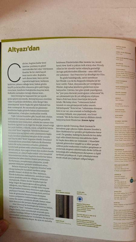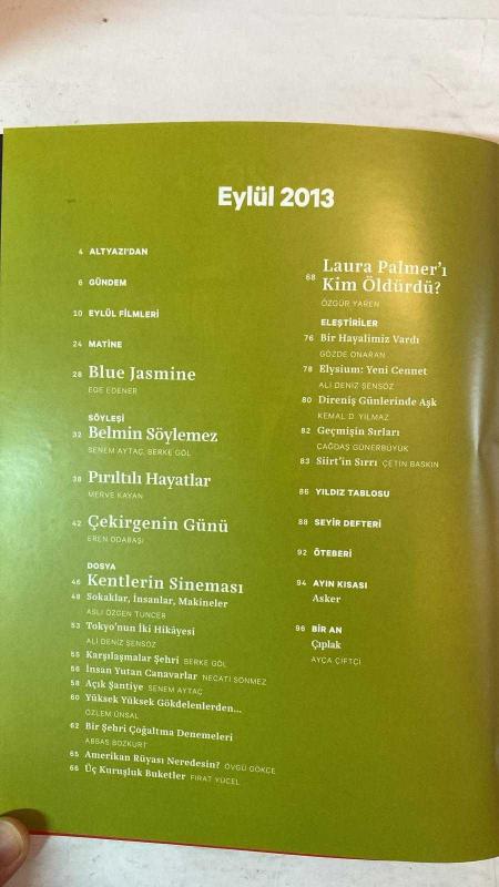 ALTYAZI AYLIK SİNEMA DERGİSİ - EYLÜL 2013 SAYI: 126 JIA ZHANGKE - ROBERT GUÉDGUIAN - PEDRO COSTA - JOSÉ LUIS GUERÍN - HOU HSIAO-HSIEN - JEM COHEN - MICHAEL GLAWOGGER - GABRIEL MASCARO - BLUE JASMINE - PIRILTILI HAYATLAR - ŞİMDİKİ ZAMAN - EGE EDENER - MERVE KAYAN - BELMİN SÖYLEMEZ - SENEM AYTAÇ - BERKE GÖL - EREN ODABAŞI - ASLI ÖZGEN TUNCER - ALİ DENİZ ŞENSÖZ - NECATİ SÖNMEZ - ÖZLEM ÜNSAL - ABBAS BOZKURT - ÖVGÜ GÖKÇE - FIRAT YÜCEL - ÖZGÜR YAREN - GÖZDE ONARAN - KEMAL D. YILMAZ - ÇAĞDAŞ GÜNERBÜYÜK - ÇETİN BASKIN - AYÇA ÇİFTÇİ KENTLERİN SİNEMASI - ÇEKİRGENİN GÜNÜ - SOKAKLAR İNSANLAR MAKİNELER - TOKYO’NUN İKİ HİKÂYESİ - KARŞILAŞMALAR ŞEHRİ - İNSAN YUTAN CANAVARLAR - AÇIK ŞANTİYE - YÜKSEK YÜKSEK GÖKDELENLERDEN - BİR ŞEHRİ ÇOĞALTMA DENEMELERİ - AMERİKAN RÜYASI NEREDESİN? - ÜÇ KURUŞLUK BUKETLER - LAURA PALMER’I KİM ÖLDÜRDÜ? - BİR HAYALİMİZ VARDI - ELYSIUM: YENİ CENNET - DİRENİŞ GÜNLERİNDE AŞK - GEÇMİŞİN SIRLARI - SİİRT’İN SIRRI - YILDIZ TABLOSU - SEYİR DEFTERİ - TAM TAKIM EKSİKSİZ 96 SAYFA, YAMAÇ OKUR tarafından kaleme alınmıştır. Eser FIRAT YÜCEL editörlüğünde hazırlanmıştır. Kitap [ŞAN OFSET MATBAA] yayınlanmıştır. 96 sayfadır. ALTYAZI AYLIK SİNEMA DERGİSİ - EYLÜL 2013 SAYI: 126 JIA ZHANGKE - ROBERT GUÉDGUIAN - PEDRO COSTA - JOSÉ LUIS GUERÍN - HOU HSIAO-HSIEN - JEM COHEN - MICHAEL GLAWOGGER - GABRIEL MASCARO - BLUE JASMINE - PIRILTILI HAYATLAR - ŞİMDİKİ ZAMAN - EGE EDENER - MERVE KAYAN - BELMİN SÖYLEMEZ - SENEM AYTAÇ - BERKE GÖL - EREN ODABAŞI - ASLI ÖZGEN TUNCER - ALİ DENİZ ŞENSÖZ - NECATİ SÖNMEZ - ÖZLEM ÜNSAL - ABBAS BOZKURT - ÖVGÜ GÖKÇE - FIRAT YÜCEL - ÖZGÜR YAREN - GÖZDE ONARAN - KEMAL D. YILMAZ - ÇAĞDAŞ GÜNERBÜYÜK - ÇETİN BASKIN - AYÇA ÇİFTÇİ KENTLERİN SİNEMASI - ÇEKİRGENİN GÜNÜ - SOKAKLAR İNSANLAR MAKİNELER - TOKYO’NUN İKİ HİKÂYESİ - KARŞILAŞMALAR ŞEHRİ - İNSAN YUTAN CANAVARLAR - AÇIK ŞANTİYE - YÜKSEK YÜKSEK GÖKDELENLERDEN - BİR ŞEHRİ ÇOĞALTMA DENEMELERİ - AMERİKAN RÜYASI NEREDESİN? - ÜÇ KURUŞLUK BUKETLER - LAURA PALMER’I KİM ÖLDÜRDÜ? - BİR HAYALİMİZ VARDI - ELYSIUM: YENİ CENNET - DİRENİŞ GÜNLERİNDE AŞK - GEÇMİŞİN SIRLARI - SİİRT’İN SIRRI - YILDIZ TABLOSU - SEYİR DEFTERİ - TAM TAKIM EKSİKSİZ 96 SAYFA adlı eser Türkçe dilindedir.