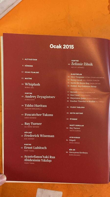ALTYAZI AYLIK SİNEMA DERGİSİ - OCAK 2015 – BERKE GÖL – ANDREY ZVYAGINTSEV – EVRİM KAYA – SERDAR KÖKÇEOĞLU – EREN ODABAŞI – ALİ DENİZ ŞENSÖZ – FREDERICK WISEMAN – EGE EDENER – ERNST LUBITSCH – FIRAT YÜCEL – YEŞİM TABAK – ŽELIMIR ŽILNIK – NECATI SÖNMEZ – FATMA CİHAN AKKARTAL – ASLI ÖZGEN TUNCER – ENGİN ERTAN – KEREM SANATEL – ÇAĞDAŞ GÜNERBUYÜK – YEŞİM BURUL – HASAN COMERT – ALİ TIRALI – YEKTA KOPAN – ÖVGÜ GÖKÇE – BARIŞ BIÇAKÇI – MITHAT ALAM – SENEM AYTAC – ABBAS BOZKURT – AYÇA ÇİFTÇİ – ZEYNEP DADAK – ÖVGÜ GÖKÇE – ENİS KÖSTEPEN – GÖZDE ONARAN – NADİR OPERLİ – ALİ DENİZ ŞENSÖZ – ASLI ÖZGEN TUNCER – AHMET M. ÖĞÜT – UĞUR ÇALIŞKAN – MEHMET ULUŞAHİN – DİLEK AYDIN – OKAY KARADAYILAR – HAKKI KURTULUŞ – AYLIN KURYEL – MELİK SARAÇOĞLU – FATİH AKIN WHIPLASH – LEVIATHAN – BAY TURNER – FOXCATCHER – YILDIZ HARİTASI – AYASTEFANOS'TAKİ RUS ABİDESİNİN YIKILIŞI – ŽELIMIR ŽILNIK – GECE VURGUNU – KAYIP ÇOCUK – KARDA BİR BEYAZ KUŞ – HOBBIT: BEŞ ORDUNUN SAVAŞI – KIRIMLI – SON UMUT – HAYATIMIN ŞANSI -96 SAYFA adlı eser Türkçe dilindedir.