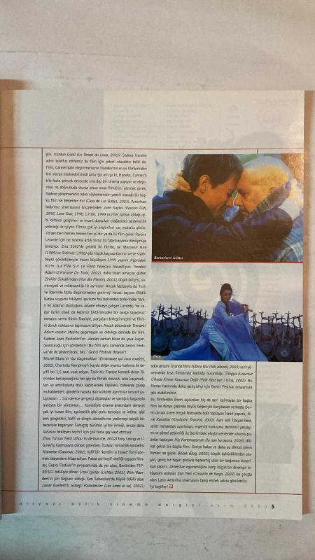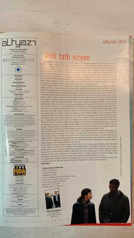 ALTYAZI AYLIK SİNEMA DERGİSİ - TARİH: EKİM 2003 SAYI: 22 - ALTIN PORTAKAL 40. YIL ÖZEL EKİ - GİZEMLİ NEHİR - KİRLİ TATLI VİZYON - MATRIX REVOLUTIONS - KARAYIP KORSANLARI - BARBARLARIN İSTİLASI - BEKLEME ODASI - KISA VE ACISIZ - İNŞAAT - NEW YORK FILM FESTIVALI - FİLMEKİMİ DİMDİK AYAKTA - THE DREAMERS - THE INTOLERABLE CRUELTY - DOGVILLE - ÇAMUR - AMERİKAN PASTASI: DÜĞÜN - ÇILGIN İKİLİ - AFİLİ DELİKANLI - SEVİYOR SEVMİYOR - SON EFSANE: COMANDANTE - ASMALI KONAK - İTALYAN İŞİ - BOX 507 - ÖLÜM OYUNU - MUHTEŞEM KAHRAMANLAR - GİZEMLİ BİR EFSANE: CLINT EASTWOOD - ÇAMUR BİR YENİDEN DOĞUŞ FİLMİ - ÇAMUR'DAN KARDEŞ MANZARALARI - OLIVER STONE'UN KÜBA TAKINTISI - AFİLİ DELİKANLI İSTİM ÜSTÜNDE - VİZYON ÖTESİ - SIRADIŞI JACQUES TATI - POLAR FİLMLERİ - POLAR'IN KORİDORLARINDA KOVALAMACA - POLİTİK SİNEMADA İDEALİZM - BOĞAZİÇİLİ YÖNETMENLER - 27. MONTREAL FILM FESTİVALİ - 9. GEZİCİ FESTİVAL - SARAYBOSNA FILM FESTİVALİ - GÖRSEL KÜLTÜRÜN GÖRSELLİĞİ - LXG - %100 BARIŞ PROJES - TAM TAKIM EKSİKSİZ 96 SAYFA, YAMAÇ OKUR tarafından kaleme alınmıştır. Eser FIRAT YÜCEL editörlüğünde hazırlanmıştır. Kitap [ŞAN OFSET MATBAA] yayınlanmıştır. 96 sayfadır. ALTYAZI AYLIK SİNEMA DERGİSİ - TARİH: EKİM 2003 SAYI: 22 - ALTIN PORTAKAL 40. YIL ÖZEL EKİ - GİZEMLİ NEHİR - KİRLİ TATLI VİZYON - MATRIX REVOLUTIONS - KARAYIP KORSANLARI - BARBARLARIN İSTİLASI - BEKLEME ODASI - KISA VE ACISIZ - İNŞAAT - NEW YORK FILM FESTIVALI - FİLMEKİMİ DİMDİK AYAKTA - THE DREAMERS - THE INTOLERABLE CRUELTY - DOGVILLE - ÇAMUR - AMERİKAN PASTASI: DÜĞÜN - ÇILGIN İKİLİ - AFİLİ DELİKANLI - SEVİYOR SEVMİYOR - SON EFSANE: COMANDANTE - ASMALI KONAK - İTALYAN İŞİ - BOX 507 - ÖLÜM OYUNU - MUHTEŞEM KAHRAMANLAR - GİZEMLİ BİR EFSANE: CLINT EASTWOOD - ÇAMUR BİR YENİDEN DOĞUŞ FİLMİ - ÇAMUR'DAN KARDEŞ MANZARALARI - OLIVER STONE'UN KÜBA TAKINTISI - AFİLİ DELİKANLI İSTİM ÜSTÜNDE - VİZYON ÖTESİ - SIRADIŞI JACQUES TATI - POLAR FİLMLERİ - POLAR'IN KORİDORLARINDA KOVALAMACA - POLİTİK SİNEMADA İDEALİZM - BOĞAZİÇİLİ YÖNETMENLER - 27. MONTREAL FILM FESTİVALİ - 9. GEZİCİ FESTİVAL - SARAYBOSNA FILM FESTİVALİ - GÖRSEL KÜLTÜRÜN GÖRSELLİĞİ - LXG - %100 BARIŞ PROJES - TAM TAKIM EKSİKSİZ 96 SAYFA adlı eser Türkçe dilindedir.