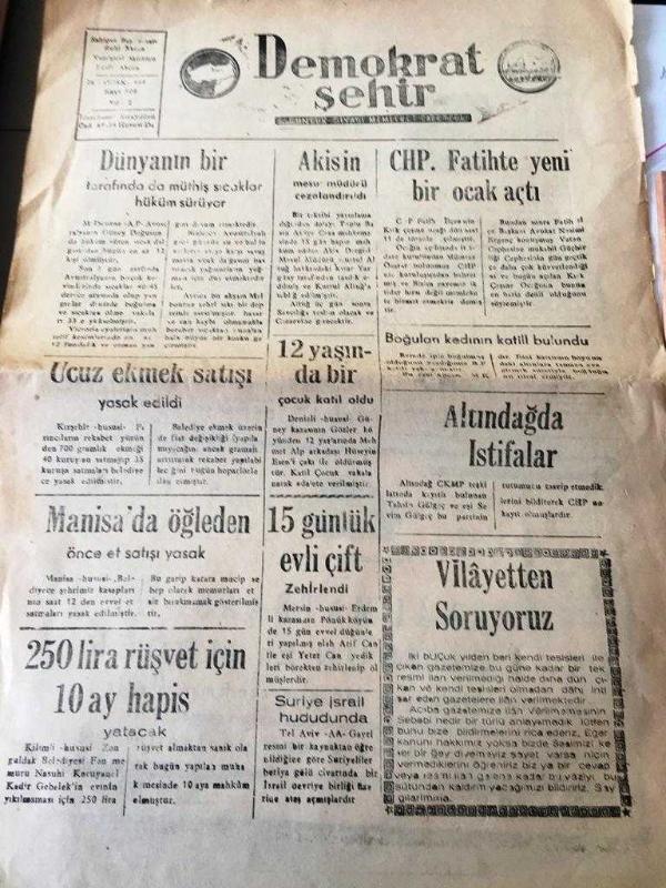 AMASYA DEMOKRAT ŞEHİR GAZETESİ YEREL TAŞRA BASINI- 26 OCAK 1959 SAYI :508 YIL :2 -Dünyanın bir tarafından da müthiş sıcaklar hüküm sürüyor - Ucuz ekmek satışı yasak edildi- Manisa da öğleden önce et satışı yasak - 250 lira rüşvet için 10 ay hapis yatacak -Akisin Mesül Müdürü Cezalandırıldı -CHP Fatih 'te yeni bir ocak açtı -Altındağ da İstifalar -15 günlük evli çift zehirlendi -Amerika da Tayfun ve Su Baskını - Geri alınan İkramiye - Kadın mahkumlara okuma yazma öğretiliyor - Yıpranma, sararmalar, kupon kesiği ve yırtılmalar zamana bağlı olarak görülebilir.