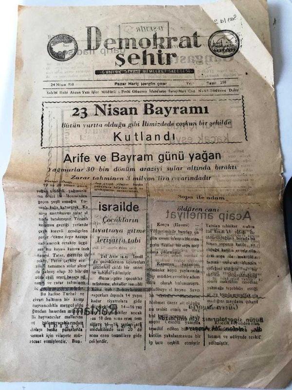AMASYA DEMOKRAT ŞEHİR YEREL TAŞRA BASINI - 24 Nisan 1958 YIL :1 SAYI :250- 23 Nisan Bayramı Bütün Yurtta Olduğu Gibi İlimizde de Coşkun Bir Şekilde Kutlandı - Arife ve Bayram Günü Yağan Yağmurlar 30 Bin Dönüm Araziyi Sular Altında Bıraktı - Büyük bir server bırakan Gangaster- Davul içinde kaçak eşya - Garip hadise Yıpranma, sararmalar, kupon kesiği ve yırtılmalar zamana bağlı olarak görülebilir.