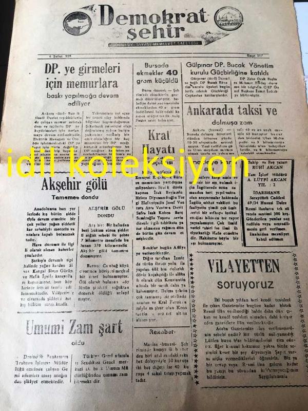 AMASYA DEMOKRAT ŞEHİR YEREL TAŞRA BASINI - -----6 Şubat 1959 Sayı :517--DP ye girmeleri için memurlara baskı yapılamağa devam ediliyor --Akşehir gölü tamamen dondu --Umumi Zam Şart Oldu --Bursa ekmekler 40 gram küçüldü --Kral Hayatı Süren Döviz Kaçakçısı---Gülpınar DP Bucak Yönetim Kurulu Güçbirliğine Katıldı --Ankara da taksi ve dolmuşa zam -Londra da tehlike içinde --Şiir Köşesi :Gurbet :Kaya Özden --DR.Meşrur Hatay 'ın Din Alimlerimiz ve Üniversite Profesörleri Tarafından Takdirle Karşılanan " MAHŞER " Adlı eser -- Yıpranma, sararmalar, kupon kesiği ve yırtılmalar zamana bağlı olarak görülebilir.