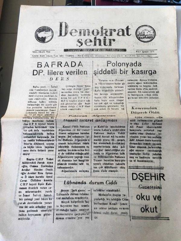 AMASYA DEMOKRAT ŞEHİR YEREL TAŞRA BASINI - --7 HAZİRAN 1958 Yıl :1 sayı :273- Bafra da D.P lilere verilen Ders - --Pakistan Afganistan Transit Ticaret Anlaşması - Polonya da şiddetli bir kasırga - Kamyondan Düşerek Öldü -Lübnan da durum ciddi ---Yeni Bir Meslek - Arjantin de Kadın Haydut Dağlara Çıktı - Bor da sel - Yeni Bir firar usulü - Yıpranma, sararmalar, kupon kesiği ve yırtılmalar zamana bağlı olarak görülebilir.