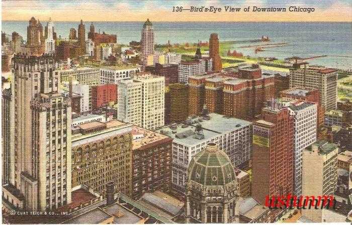 ** BIRD'S EYE VIEW OF DOWNTOWN CHICAGO ** 14 x 9 cm.ebadında,arkası yazısız,kullanılmamış,çil durumda, eski Amerikan baskısı Chicago şehri kuşbakışı kartpostal...