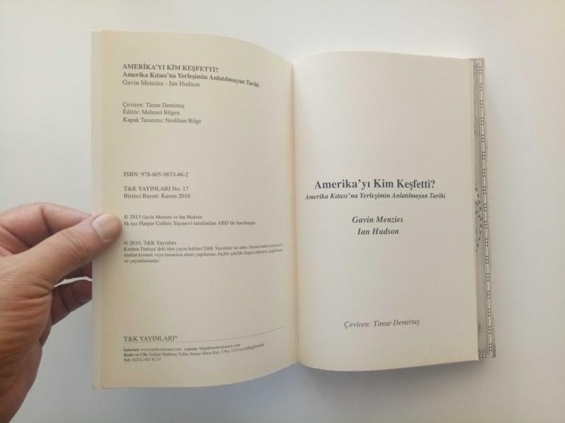 AMERİKA'YI KİM KEŞFETTİ? (AMERİKA KITASINA YERLEŞİMİN ANLATILMAYAN TARİHİ) (2. EL), GAVIN MENZIES, IAN HUDSON tarafından kaleme alınmıştır. Eser MEHMET BİLGEN editörlüğünde hazırlanmıştır. Kitap 2016 yılında TARİH & KURAM YAYINLARI tarafından 978-605-9833-46-2 ISBN kodu ile yayınlanmıştır. Satışta olan kitap, yayınevinin 1. baskısıdır. Bu baskının çevirisi TİMUR DEMİRTAŞ tarafından yapılmıştır. 279 sayfadır. Sayfa bilgisi 2. HAMUR olarak belirtilmiştir. AMERİKA'YI KİM KEŞFETTİ? (AMERİKA KITASINA YERLEŞİMİN ANLATILMAYAN TARİHİ) (2. EL) adlı eser Türkçe dilindedir.