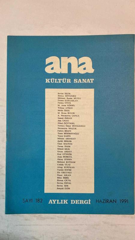 ANA KÜLTÜR SANAT, ŞİİR DERGİSİ - HAZİRAN 1991 SAYI: 182 SEVİM İŞLER – HATİCE SÖYLEMEZ – MEHMET RASİM MUTLU – FATMA KARAASLAN – FATMA ONUR – M. ASIM GÖRBİL – YILMAZ AYBAR – MELİH ÖZER – M. İHSAN BULUR – A. NECMETTİN ÇANGA – İSMAİL ÖZKAN – JALE UNAN – NIHAT ÖZYÜKSEL – TORNACI ÖMER DEVELİOĞLU – NECMETTİN SELÇUK – FAHİRE BELEN – YASER BEREKETOĞLU – VURAL ŞAHİN – MÜNİRE AKSARAY – AYTÜL DİNLER – ÜMİT MALKOÇ – TURAN İNAM – MİKAIL KILIÇ – ERCAN AKBAY – EROL GÜNGÖR – AYŞE MORGÜL – OKTAY ZERRİN – MEHMET BAYRAM – CAHİDE ULAŞ – ALTUĞ KURTKAN – TURABİ DOĞRİ – EFE URGUNLU – ÖMER ASLAN – MİNE ERBİL – EKREM ÇİÇEK – SEVİNÇ ERDAL – SEVİM IŞIK – SONGÜL ZAİM – HASAN SAMİ EMİROĞLU – MEHMET POYRAZ YAĞMUR – BİR BİZ… – USULCA GİTMİŞ – TEK BAŞINA BAĞIMSIZ ÖZGÜRLÜK’TEN GÖRÜNÜM – SESSİZ DÜNYA – YOKLUĞUN YAKTI BENİ – 1991 YILI ANA DERGİSİ GÜFTE YARIŞMASI DUYURUSU – LIONESS SANATÇILARI SERGİSİ – VAKIF HAFTASI ETKİNLİKLERİ – 8 MART DÜNYA KADINLAR GÜNÜ SERGİSİ – YUNUS EMRE SEVGİ GÜNÜ – YAŞARK - TAM TAKIM 36 SAYFA, NECLA ÜNAL tarafından kaleme alınmıştır. Eser İLHAMİ SEFA ÜNAL editörlüğünde hazırlanmıştır. ANA KÜLTÜR SANAT, ŞİİR DERGİSİ - HAZİRAN 1991 SAYI: 182 SEVİM İŞLER – HATİCE SÖYLEMEZ – MEHMET RASİM MUTLU – FATMA KARAASLAN – FATMA ONUR – M. ASIM GÖRBİL – YILMAZ AYBAR – MELİH ÖZER – M. İHSAN BULUR – A. NECMETTİN ÇANGA – İSMAİL ÖZKAN – JALE UNAN – NIHAT ÖZYÜKSEL – TORNACI ÖMER DEVELİOĞLU – NECMETTİN SELÇUK – FAHİRE BELEN – YASER BEREKETOĞLU – VURAL ŞAHİN – MÜNİRE AKSARAY – AYTÜL DİNLER – ÜMİT MALKOÇ – TURAN İNAM – MİKAIL KILIÇ – ERCAN AKBAY – EROL GÜNGÖR – AYŞE MORGÜL – OKTAY ZERRİN – MEHMET BAYRAM – CAHİDE ULAŞ – ALTUĞ KURTKAN – TURABİ DOĞRİ – EFE URGUNLU – ÖMER ASLAN – MİNE ERBİL – EKREM ÇİÇEK – SEVİNÇ ERDAL – SEVİM IŞIK – SONGÜL ZAİM – HASAN SAMİ EMİROĞLU – MEHMET POYRAZ YAĞMUR – BİR BİZ… – USULCA GİTMİŞ – TEK BAŞINA BAĞIMSIZ ÖZGÜRLÜK’TEN GÖRÜNÜM – SESSİZ DÜNYA – YOKLUĞUN YAKTI BENİ – 1991 YILI ANA DERGİSİ GÜFTE YARIŞMASI DUYURUSU – LIONESS SANATÇILARI SERGİSİ – VAKIF HAFTASI ETKİNLİKLERİ – 8 MART DÜNYA KADINLAR GÜNÜ SERGİSİ – YUNUS EMRE SEVGİ GÜNÜ – YAŞARK - TAM TAKIM 36 SAYFA adlı eser Türkçe dilindedir.
