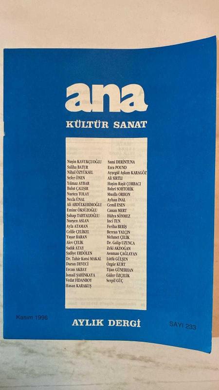 ANA KÜLTÜR SANAT, ŞİİR DERGİSİ - KASIM 1996 — SAYI: 233 NUŞİN KAVUKÇUOĞLU - SAMİ DERİNTUNA - SALİHA BATUR - NIHÂL ÖZYÜKSEL - SEFER ÖNEN - YILMAZ AYBAR - EZRA POUND - AYŞEGÜL AŞKIM KARAGÖZ - ALİ SIRTLI - HAŞİM RAŞİT ÇORBACI - BULUT ÇALIŞIR - BAHRI SOHTORIK - NURTEN TOLAY - MUALLA ORHON - NECLÂ ÜNAL - AYHAN İNAL - ALİ ABDÜLKERİMOĞLU - EMİNE ÖKSÜZOĞLU - ŞAHAP TAHTALIOĞLU - NURŞEN ASLAN - AYLA ATAMAN - CELİLE ÇELİKEL - YAŞAR BARAN - ALEV ÇELİK - SADIK ATAY - ŞADİYE ERDÖLEN - TAHİR KUTSİ MAKAL - DURAN DEVECİ - ERCAN AKBAY - İSMAİL ŞAHİNKAYA - VEDAT FİDANBOY - HASAN KARAKUŞ - CEMİL ESEN - CANAN MERT - HÜLYA SÖNMEZ - İNCİ TUN - FERIHA BERİŞ - BERRAN YALÇIN - MEHMET ÇELİK - GALİP UZUNCA - ZEKİ AKDOĞAN - ASUMAN ÇAĞLAYAN - LÜTFÜ GÜLŞEN - ÖZGÜR KURT - TIJAN GÜNERHAN - GÜLER ÖZÇELİK - SERPİL GÜÇ KÜLTÜR SANAT - ATAMA SESLENİŞİM - 10 KASIM - IŞIKSIN ATATÜRK - SANATSIZ KALAN BİR MİLLETİN - TAM TAKIM 36 SAYFA, NECLA ÜNAL tarafından kaleme alınmıştır. Eser İLHAMİ SEFA ÜNAL editörlüğünde hazırlanmıştır. ANA KÜLTÜR SANAT, ŞİİR DERGİSİ - KASIM 1996 — SAYI: 233 NUŞİN KAVUKÇUOĞLU - SAMİ DERİNTUNA - SALİHA BATUR - NIHÂL ÖZYÜKSEL - SEFER ÖNEN - YILMAZ AYBAR - EZRA POUND - AYŞEGÜL AŞKIM KARAGÖZ - ALİ SIRTLI - HAŞİM RAŞİT ÇORBACI - BULUT ÇALIŞIR - BAHRI SOHTORIK - NURTEN TOLAY - MUALLA ORHON - NECLÂ ÜNAL - AYHAN İNAL - ALİ ABDÜLKERİMOĞLU - EMİNE ÖKSÜZOĞLU - ŞAHAP TAHTALIOĞLU - NURŞEN ASLAN - AYLA ATAMAN - CELİLE ÇELİKEL - YAŞAR BARAN - ALEV ÇELİK - SADIK ATAY - ŞADİYE ERDÖLEN - TAHİR KUTSİ MAKAL - DURAN DEVECİ - ERCAN AKBAY - İSMAİL ŞAHİNKAYA - VEDAT FİDANBOY - HASAN KARAKUŞ - CEMİL ESEN - CANAN MERT - HÜLYA SÖNMEZ - İNCİ TUN - FERIHA BERİŞ - BERRAN YALÇIN - MEHMET ÇELİK - GALİP UZUNCA - ZEKİ AKDOĞAN - ASUMAN ÇAĞLAYAN - LÜTFÜ GÜLŞEN - ÖZGÜR KURT - TIJAN GÜNERHAN - GÜLER ÖZÇELİK - SERPİL GÜÇ KÜLTÜR SANAT - ATAMA SESLENİŞİM - 10 KASIM - IŞIKSIN ATATÜRK - SANATSIZ KALAN BİR MİLLETİN - TAM TAKIM 36 SAYFA adlı eser Türkçe dilindedir.