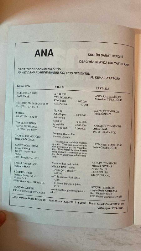 ANA KÜLTÜR SANAT, ŞİİR DERGİSİ - KASIM 1996 — SAYI: 233 NUŞİN KAVUKÇUOĞLU - SAMİ DERİNTUNA - SALİHA BATUR - NIHÂL ÖZYÜKSEL - SEFER ÖNEN - YILMAZ AYBAR - EZRA POUND - AYŞEGÜL AŞKIM KARAGÖZ - ALİ SIRTLI - HAŞİM RAŞİT ÇORBACI - BULUT ÇALIŞIR - BAHRI SOHTORIK - NURTEN TOLAY - MUALLA ORHON - NECLÂ ÜNAL - AYHAN İNAL - ALİ ABDÜLKERİMOĞLU - EMİNE ÖKSÜZOĞLU - ŞAHAP TAHTALIOĞLU - NURŞEN ASLAN - AYLA ATAMAN - CELİLE ÇELİKEL - YAŞAR BARAN - ALEV ÇELİK - SADIK ATAY - ŞADİYE ERDÖLEN - TAHİR KUTSİ MAKAL - DURAN DEVECİ - ERCAN AKBAY - İSMAİL ŞAHİNKAYA - VEDAT FİDANBOY - HASAN KARAKUŞ - CEMİL ESEN - CANAN MERT - HÜLYA SÖNMEZ - İNCİ TUN - FERIHA BERİŞ - BERRAN YALÇIN - MEHMET ÇELİK - GALİP UZUNCA - ZEKİ AKDOĞAN - ASUMAN ÇAĞLAYAN - LÜTFÜ GÜLŞEN - ÖZGÜR KURT - TIJAN GÜNERHAN - GÜLER ÖZÇELİK - SERPİL GÜÇ KÜLTÜR SANAT - ATAMA SESLENİŞİM - 10 KASIM - IŞIKSIN ATATÜRK - SANATSIZ KALAN BİR MİLLETİN - TAM TAKIM 36 SAYFA adlı eser, Kitap > Süreli Yayınlar > Dergiler > Magazin, Moda kategorisinde İkinci El olarak satıştadır.