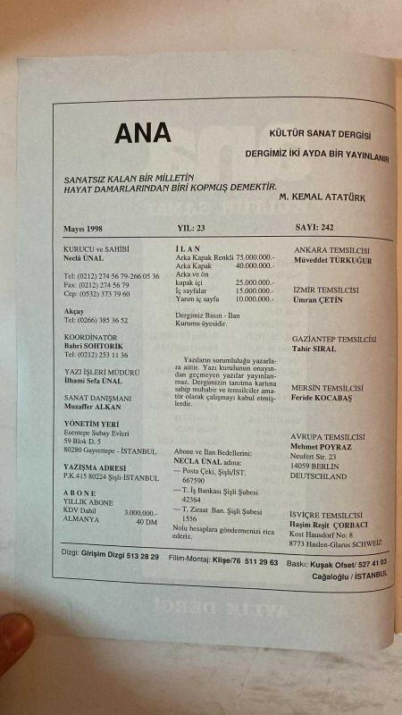 ANA KÜLTÜR SANAT, ŞİİR DERGİSİ - MAYIS 1998 — SAYI: 242 MÜVEDDET T. YAYIKOĞLU - FATMA ONUR - NECLÂ ÜNAL - GALİP UZUNCA - YILMAZ AYBARTH - SADIK ATAY - NEJAT GÜLÜMSER - SAMİYE ATAERGIN - MEHMET AHI AKIN - SİBEL DEMİRİZ - AYLA AYDIN - NECATİ ERDEK - BELGİN ALAGÖZ - SAMİ DERİNTUNA - METİN KOCA - ÖZCAN ATAMERT - GÜNER CEYLAN - CELİLE ÇELİKEL - DAVUT İBRAHİMOĞLU - NURDANE UZUN TEMUR - ENGİN ÇIR - HAŞİM REŞİT ÇORBACI - DÖNE KÖSE - İSMAİL HAKKI SIR - CENGİZ YAKUT - ALİ ABDÜLKERİMOĞLU - BAHRİ SOHTORİK - TURHAN TAŞAN - HÜSEYİN GÜLER - MEHMET ENGİN - MUALLA ORHON - BEDRİYE ERDAĞ GÜREL - VEDAT FİDANBOY - MUSTAFA KARAMELEK - SEVİNÇ ERDAL - MEHMET CEM YİĞİT - AYLA ATAMAN - ÜMİT MALKOÇ - MEHLIKA BAŞER - LATİF KARAGÖZ - MAHMUT BOZTEPE - NEVİN ATEŞOĞLU - İNCİ KOLBAY - HASAN OZAN - MUSTAFA ACAR - MEHMET GÜVEN - ALİ IŞIK - MEHMET ARSLAN - CEMAL KARAAĞAÇ - SÜHEYLA KUTBAY - İSMİHAN ŞİRİN - LÜTFÜ GÜLŞEN - TURGUT YARKENT - MÜNEVVER SÖNMEZ - VEYSEL UYANIK KÜLTÜR SANAT - ANNE - ANAM - A - TAM TAKIM 36 SAYFA adlı eser, Kitap > Süreli Yayınlar > Dergiler > Magazin, Moda kategorisinde İkinci El olarak satıştadır.