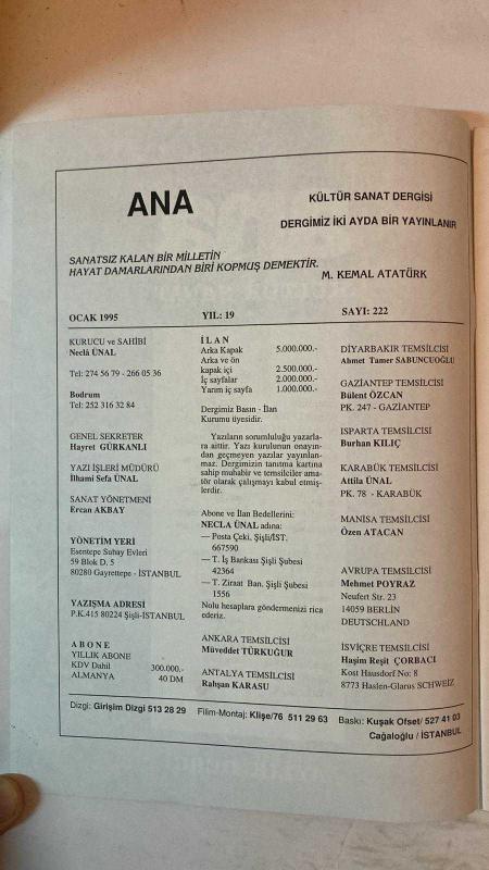 ANA KÜLTÜR SANAT, ŞİİR DERGİSİ - OCAK 1995 SAYI: 222 ÖMER ASLAN - YILDIZ YILMAZ - NECLA UNAL - EROL GÜNGÖR - YILMAZ AYBAR - MÜVEDDET T. YAYIKOĞLU - OSMAN KARAASLAN - GÜNÇE ÇETİN - ALI MUHIDDIN ESMER - GÜLSEVİNÇ DEMİR - BAISE RİZELİ - ŞÜKRAN YÜCEDAĞ - YILMAZ YÜKSEL GÜNGÖR - TÜLAY ÇAKIR - ÖZCAN ATAMERT - NIHAT ÖZYÜKSEL - TURHAN TASAN - EMINE PORTAKAL - SADIK ATAY - ŞEYDA TEMUCİN - SAVAŞ GÜR - MUHTEREM DURUKAN - ISMIHAN ŞIRIN - CEMIL ÖZFIRAT - OYA ŞAKAR - GUFRAN TAŞ - HAYRET GÜRKANLI - ATTILA ÜNAL - ERCAN AKBAY - SADETTIN TİRYAKİ - NERMIN AKYILDIZ - HÜSEYIN ÖZMEN - FATMA ONUR - ISMET TURÇAL - NURSEN DELİKTAŞ - MUALLA ORHON - ENGIN ÇIR - TURABI DOGRI - SUAT YIGMATEPE - EKREM ÇİÇEK - İBRAHIM YILDIZ - ÇAĞKAN ÜLKÜ - ŞAHAP TAHTALIOĞLU - SEVINÇ ERDAL - DOĞAN DOĞAN - SALIHA Ü. TERCANLI - YALÇIN BENLİCAN - RAHŞAN KARASU - AHMET TAMER SABUNCUOĞLU - BÜLENT ÖZCAN - BURHAN KILIÇ - ÖZEN ATACAN - MEHMET POYRAZ - HAŞIM REŞİT ÇORBACI - ÜNAL YÜREKLİ - ALI ABDÜLKERİMOĞLU - O. NURI ERD - TAM TAKIM 36 SAYFA adlı eser, Kitap > Süreli Yayınlar > Dergiler > Magazin, Moda kategorisinde İkinci El olarak satıştadır.