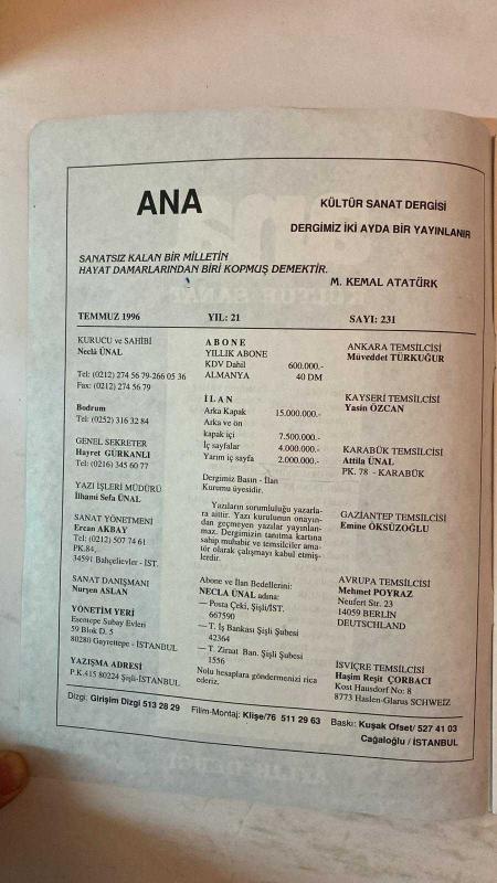 ANA KÜLTÜR SANAT, ŞİİR DERGİSİ - TEMMUZ 1996 — SAYI: 231 HALİM UĞURLU - MEHMET YILMAZ - ŞAHAP TAHTALIOĞLU - NURAY KORKMAZ - YILMAZ AYBAR - ÖZCAN ATAMERT - NURŞEN ASLAN - TURHAN TAŞAN - EMİNE ÖKSÜZOĞLU - ŞADİYE ERDÖLEN - NECLÂ ÜNAL - NEVİN GÜNEŞ - HAŞİM REŞİT ÇORBACI - SALİHA ÜREŞ TERCANLI - MUALLA ORHON - ERCAN AKBAY - TURGUT YARKENT - İSMAİL ACAR - HASAN KARAKUŞ - KENAN AKANSU - ASİYE KAYA YILDIZ - NURDANE TEMUR - ALİ SIRTLI - ALİ NAMIK TÜZÜN - NECMETTİN ÇANGA - FAHİRE BELEN - SELDA GÖÇERİ - CAHİDE ATAKUL - MÜNEVVER ERİLMEZ - FİKRET ERİM - ÖNDER KAYA - MEHMET YÜCEL - BETÜL YAĞSAĞAN - GALİP UZUNCA - AHMET AYAZ - SEVİNÇ ERDAL - TÜLİN SOY - ZERRİN ÇETE - AZMİ KUTOĞLU - İSMAİL SOYSAL - AYSEL ÖZDEMİR - NİHAL ÖZYÜKSEL - BAISE RİZELİ - CANAN GÜÇLÜ - ÖZCAN BAKIRCI - EKREM ÇİÇEK - MESUT ÇİFTÇİ KÜLTÜR SANAT - LİBİDO - ASKERİM - SANATSIZ KALAN BİR MİLLETİN - TAM TAKIM 36 SAYFA adlı eser, Kitap > Süreli Yayınlar > Dergiler > Magazin, Moda kategorisinde İkinci El olarak satıştadır.