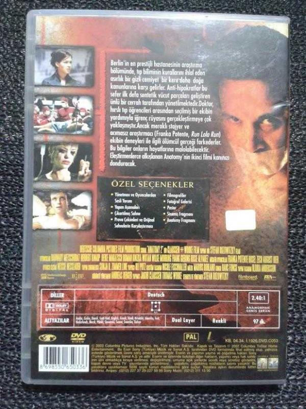 Berlin’in en prestijli hastanesinin araştırma bölümünde, tıp biliminin kurallarını ihlal eden asırlık bir gizli cemiyet bir kere daha doğa kanunlarına karşı gelirler. Anti-hipokratlar bu sefer ilk defa sentetik vücut parçaları geliştiren ünlü bir cerrah tarafından yönetilmektedir. Doktor, hırslı tıp öğrencileri arasından seçilmiş bir ekibin yardımıyla iğrenç rüyasını gerçekleştirmeye çok yaklaşmıştır.Ancak meraklı stajyer ve acımasız araştırmacı (Franka Potente, Run Lola Run) ekibin deneyleri ile ilgili ölümcül gerçeği farkederler. Bu bilgiler onların hayatlarına malolabilecektir. Eleştirmenlerce alkışlanan Anatomy’nin ikinci filmi kanınızı donduracak. * Yeni Ayarında Sıfır çizik tertemiz bir DVD *18 Yaşından küçüklerin izlemesi sakıncalıdır. Altyazı: Türkçe dahil çoklu dil seçenekli. Ses: Almanca Tür: Gerilim Yılı: 2003 Format: Dual Layer