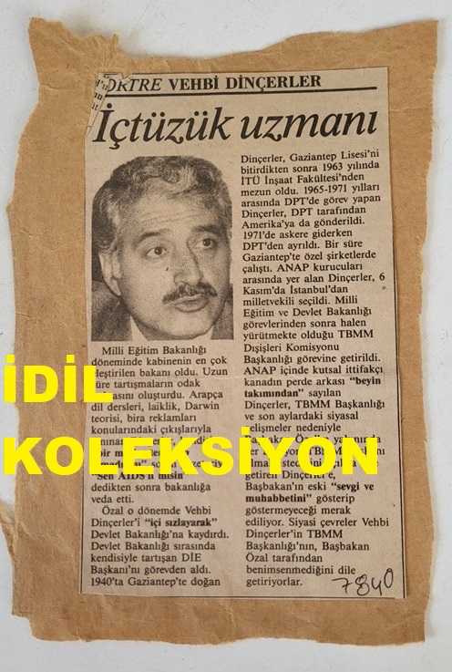 ANAVATAN PARTİSİ'NİN (ANAP) KURUCULARINDAN, ESKİ MİLLİ EĞİTİM GENÇLİK ve SPOR BAKANI VEHBİ DİNÇERLER'İN GAZETEDEN KESİLME FOTOĞRAFLI HABER KÜPÜRÜ - 15 x 9 cm EBADINDA - PORTRE VEHBİ DİNÇERLER. ''İÇTÜZÜK UZMANI'', 5 saat önce satışa sunulmuştur.