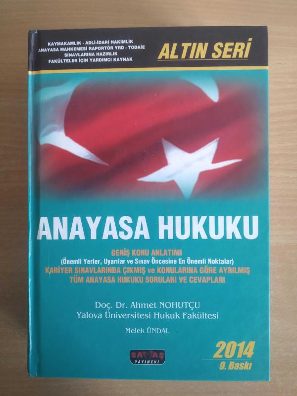 ANAYASA HUKUKU ( ALTIN SERİ - GENİŞ KONU ANLATIMI ), DOÇ.DR. AHMET NOHUTÇU - MELEK ÜNDAL tarafından kaleme alınmıştır. Kitap 2014 yılında SAVAŞ YAYINEVİ tarafından [ANKARA] 9786055662493 ISBN kodu ile yayınlanmıştır. Satışta olan kitap, yayınevinin 9. baskısıdır. 837 sayfadır. ANAYASA HUKUKU ( ALTIN SERİ - GENİŞ KONU ANLATIMI ) adlı eser Türkçe dilindedir.