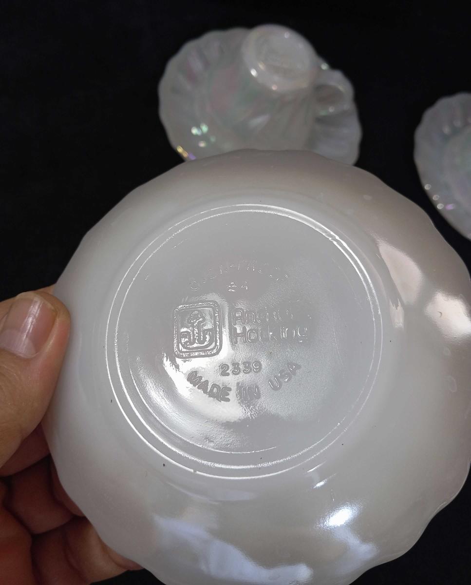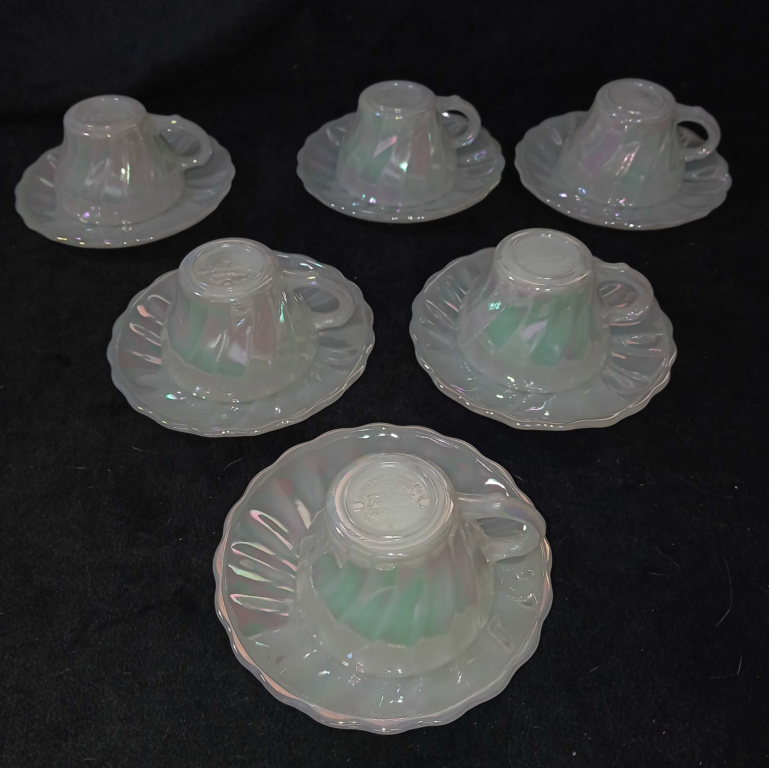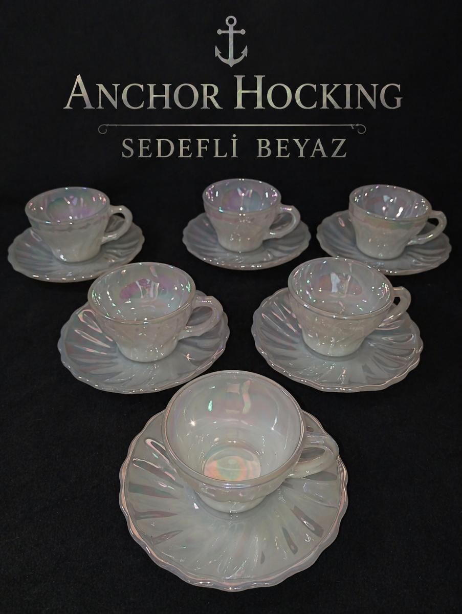 ANCHOR Hocking USA imali Türk kahve takımı ( 6 fincan 6 tabak) -Sedefli beyaz başlıklı antika/koleksiyon objesi Amerika menşe’lidir. 1950-1999 arası dönemine aittir.