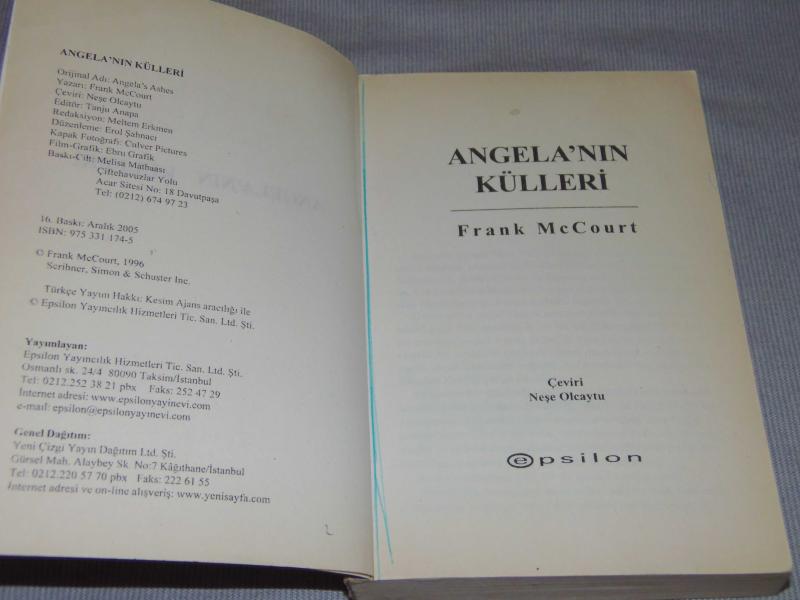 ANGELA'NIN KÜLLERİ HATIRALAR-FRANK McCOURT--EPSİLON YAYINLARI-2005 YILI BASKISI TEMİZ KULLANILMIŞ PROBLEMSİZ KİTAPTIR..SADECE SIRT KISMININ ÜST TARAFINDA YIRTIK VARDIR.AMA İÇİNE ZARARI YOKTUR. BDRK-