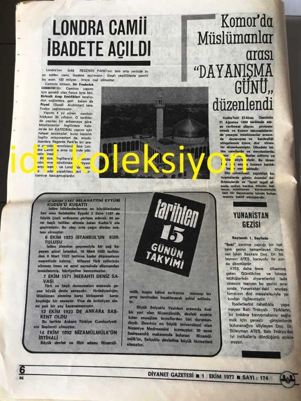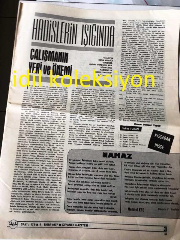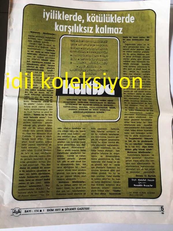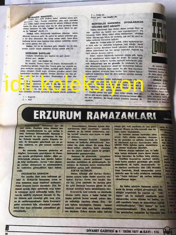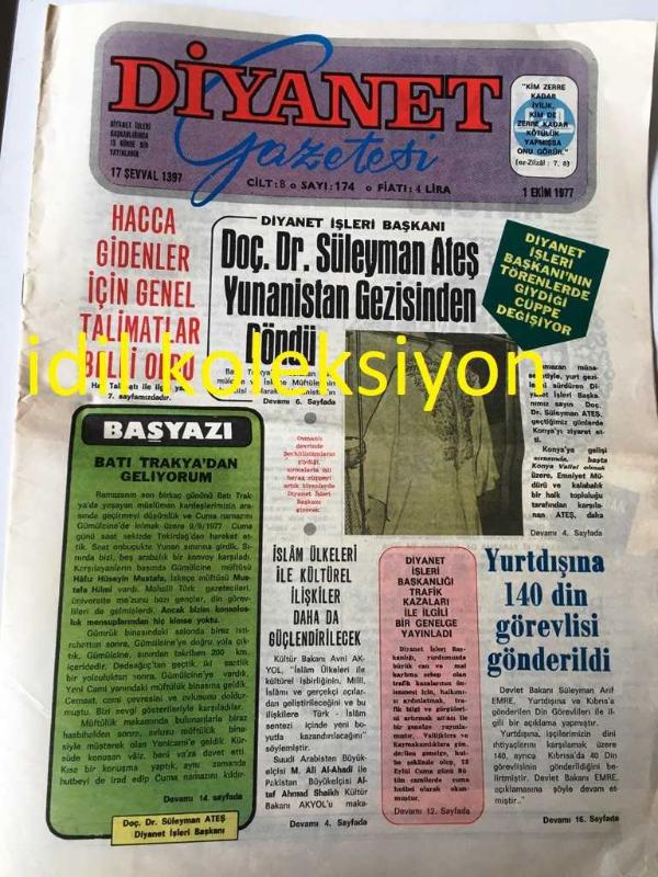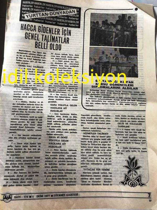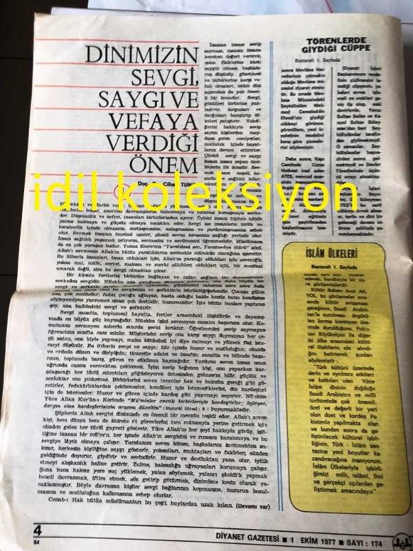 ANKARA DİYANET GAZETESİ YEREL TAŞRA BASINI --- 1 Ekim 1977 Sayı :174--Hacca Gidenler İçin Genel Talimatlar Belli Oldu --Doç .Dr .Süleyman Ateş Yunanistan Gezisinden Döndü --Yurt Dışına 140 Din Görevlisi Gönderildi --Kuranı 'ın Allah 'ın Varlığını İspat Metodu :Mustafa Türkgülü --Hadislerin Işında çalışmanın yeri ve önemi ---Namaz :Mehmet Efe --Dinimiz sevgi ve saygı vefaya verdiği önem :doç .dr. Cihad Tunç --Hz ALİ :Mehmet Yıldız -- Yıpranma, sararmalar, kupon kesiği ve yırtılmalar zamana bağlı olarak görülebilir.
