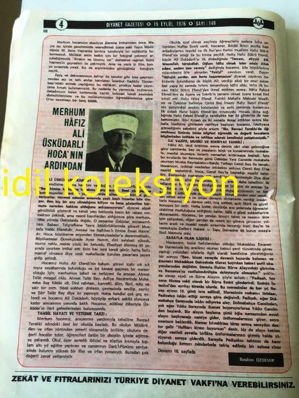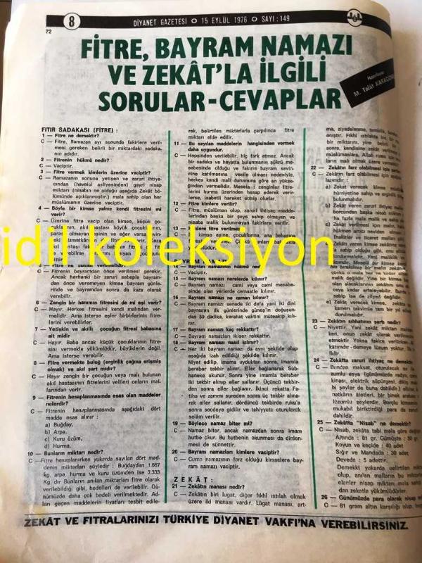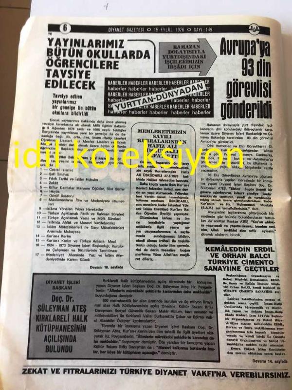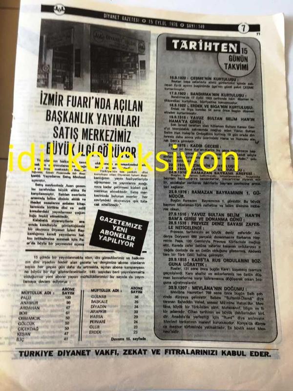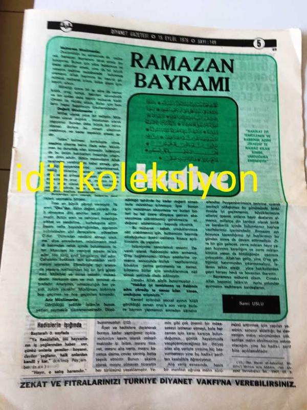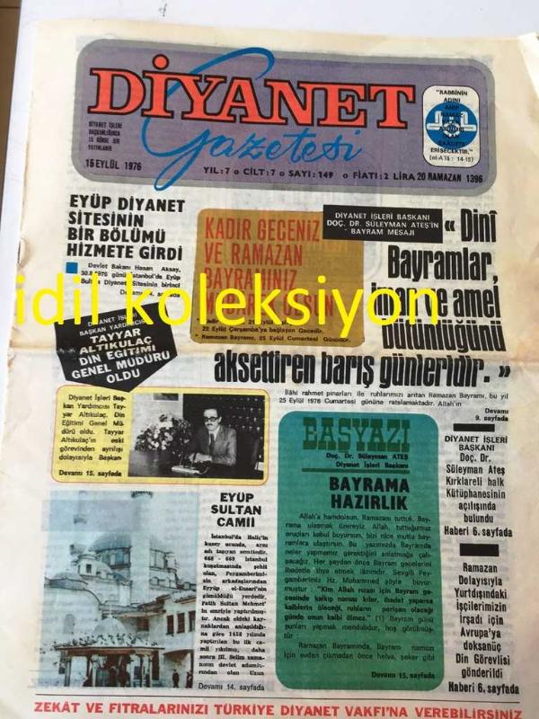 ANKARA DİYANET GAZETESİ YEREL TAŞRA BASINI ----- 15 Eylül 1976 Yıl :7 Sayı :149--Eyüp Diyanet Sitesinin Bir Bölümü Hizmete Girdi --Dini Bayramlar İman ve Amel Bütünlüğü Aksettiren Barış Günleridir --Yurt Savunması :Feyyaz Yaşar :Gaziantep Müftüsü --Alış veriş yemin :Osman Cilacı ---Merhum Hafız Ali Üsküdarlı Hoca 'nın Ardından :İbrahim Özdemir --Avrupa 'ya 93 din görevlisi gönderildi --İzmir Fuarı 'nda açılan başkanlık yayınları satış merkezimiz büyük ilgi görüyor --Kadir Gecesi -- Yıpranma, sararmalar, kupon kesiği ve yırtılmalar zamana bağlı olarak görülebilir.